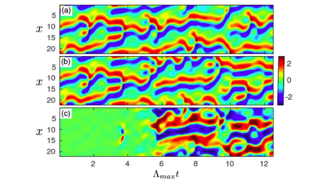 利用上述方法,文章作者在一个叫做 Kuramoto-Sivashinsky(KS) 方程的时空混沌系统上小试牛刀。KS 方程为: