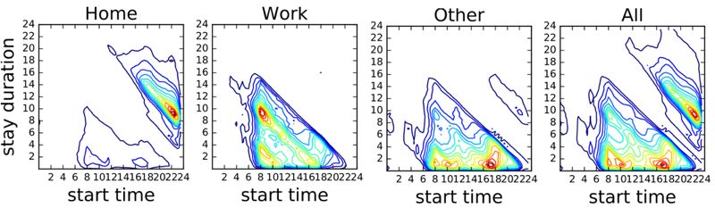 在上图中,横坐标表示用户到达某地的时刻,纵坐标表示在该地停留的时长,其中图1表示家,图2则表示工作地点,可以看到,人们不论什么时候回家,都会在第二天早上约8:00离开家,同样,无论到达工作地点的时间如何,人们通常会在最晚22:00离开。