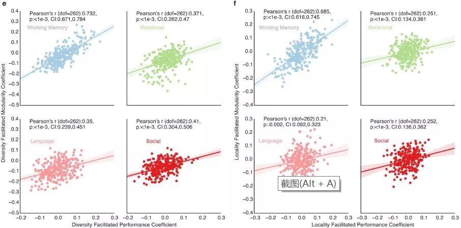 图6:连接枢纽和区域枢纽同时促进模块性和任务表现。认知任务包括:工作记忆(蓝色),关系(绿色),语言和数学(粉色),社会(红色)。图中,横轴是连接性(左:多样性;右:局域性)促进表现系数,纵轴是连接性(左:多样性;右:局域性)促进模块性系数。识图方法见图6图注。