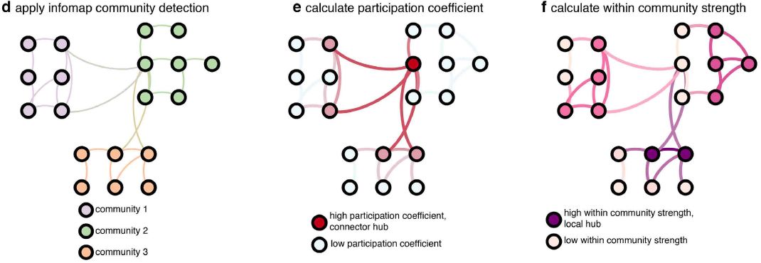 测量 系数 | 社团内连接强度(within community strength) | 参与系数 (participation coefficient) |