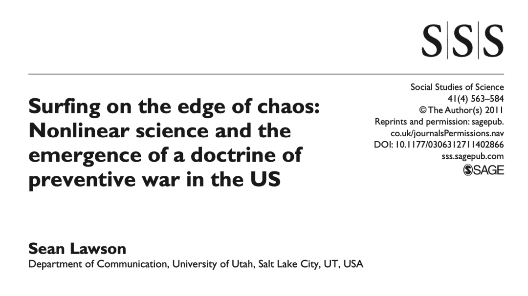 Surfing on the edge of chaos: Nonlinear science and the emergence of a doctrine of preventive war in the UShttps://journals.sagepub.com/doi/abs/10.1177/0306312711402866
