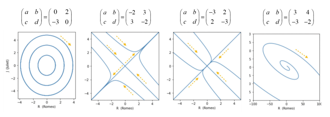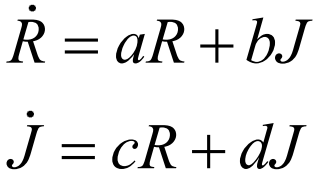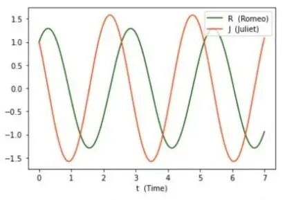 表示R随时间t的变化,所以当我们知道f(R),也就知道了R的变化规则,且该规则是固定不变的。在这样的情况下,只要该系统的初始条件已知,理论上我们就能够利用这个变化规则f(R)推导出之后任一时刻的R。上述过程就是我们去分析、预测一个动力系统的基本思路,但这个系统是一个仅包含一个变量R的一维系统,并没有其他变量与其进行交互,所以略显单调。下面我们加入一个新变量J到系统中,给两个变量赋予含义,并且让他们之间产生互动,从而使我们的系统丰富起来。我们假设此时爱可以量化, R表示罗密欧爱朱丽叶的程度,J表示朱丽叶爱罗密欧的程度,而他们双方爱意的变化遵从这个规则:![]()