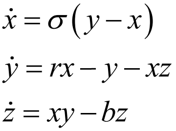 混沌呈现出系统对初始条件的敏感性,即同一系统,在初始条件有细微差异的前提下,会导出两种完全不同的发展情况,其实也就是我们熟知的蝴蝶效应:一只蝴蝶在巴西扇动一下翅膀会在美国的得克萨斯州引起一场龙卷风。拿洛伦兹系统来举例,如下面的动图所示,即使一开始两个点相距很近,以至于运动一段时间我们都看不出原来是两个点,但随着时间推移,两个点俨然开始走起各自的轨道,且两条轨道毫不相关,唯一的相似之处便是被限制在一定的运动范围内,而这个是该系统两个吸引子的影响。洛伦兹系统遵从的运动规则由以下三个方程决定:至于如何衡量一个系统对初始条件的敏感性,依靠的就是李雅普诺夫指数,它是用来描述两个点相互远离的速度。如下图所示的一个系统中的两条轨道:设初始时刻(t=0),两点的距离为