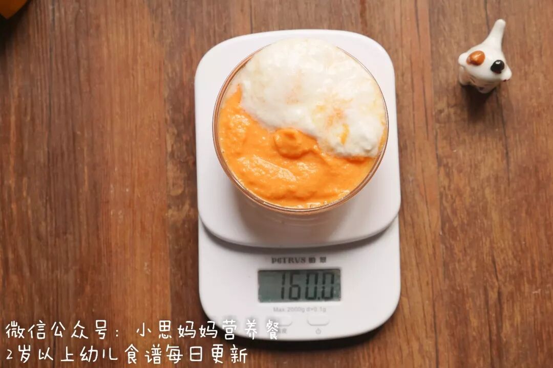 6. 最后称出160g胡萝卜酸奶糊,如果不够的话,可以再加点酸奶来凑成160g。