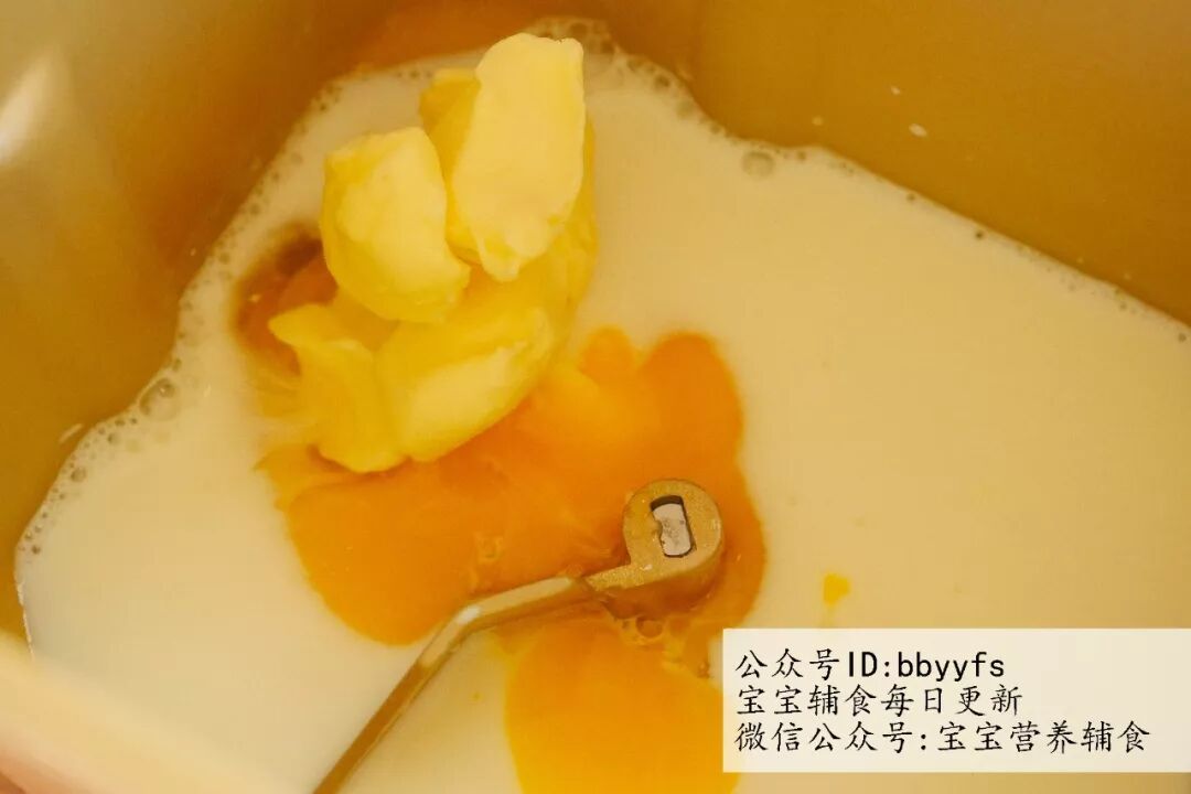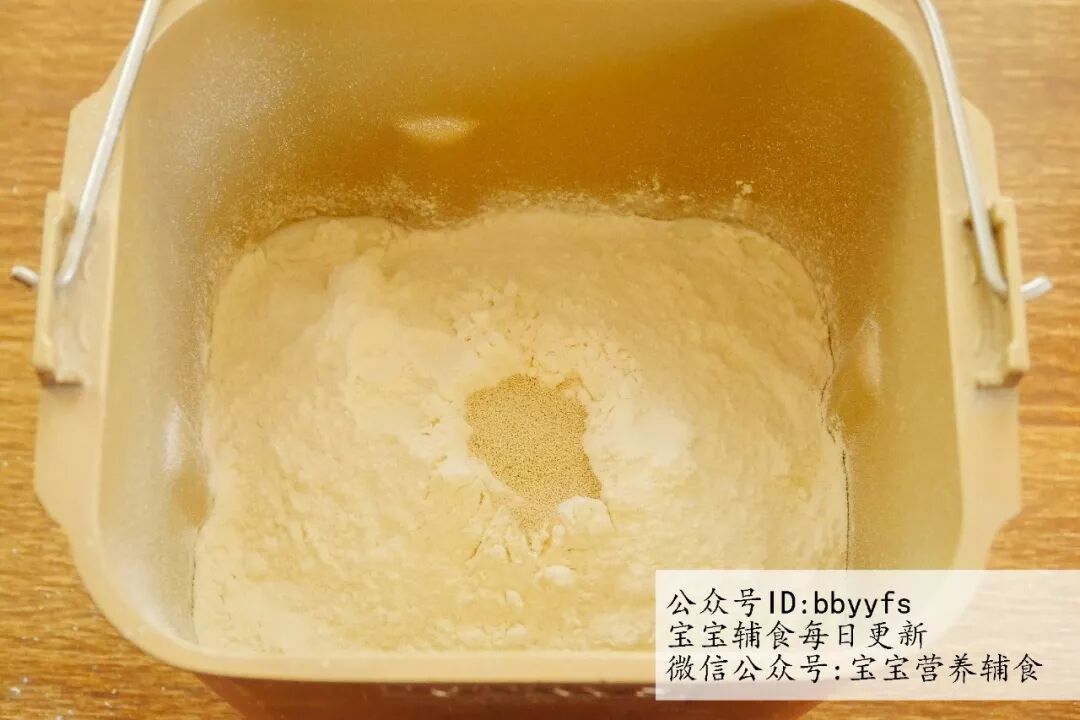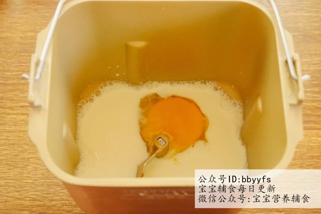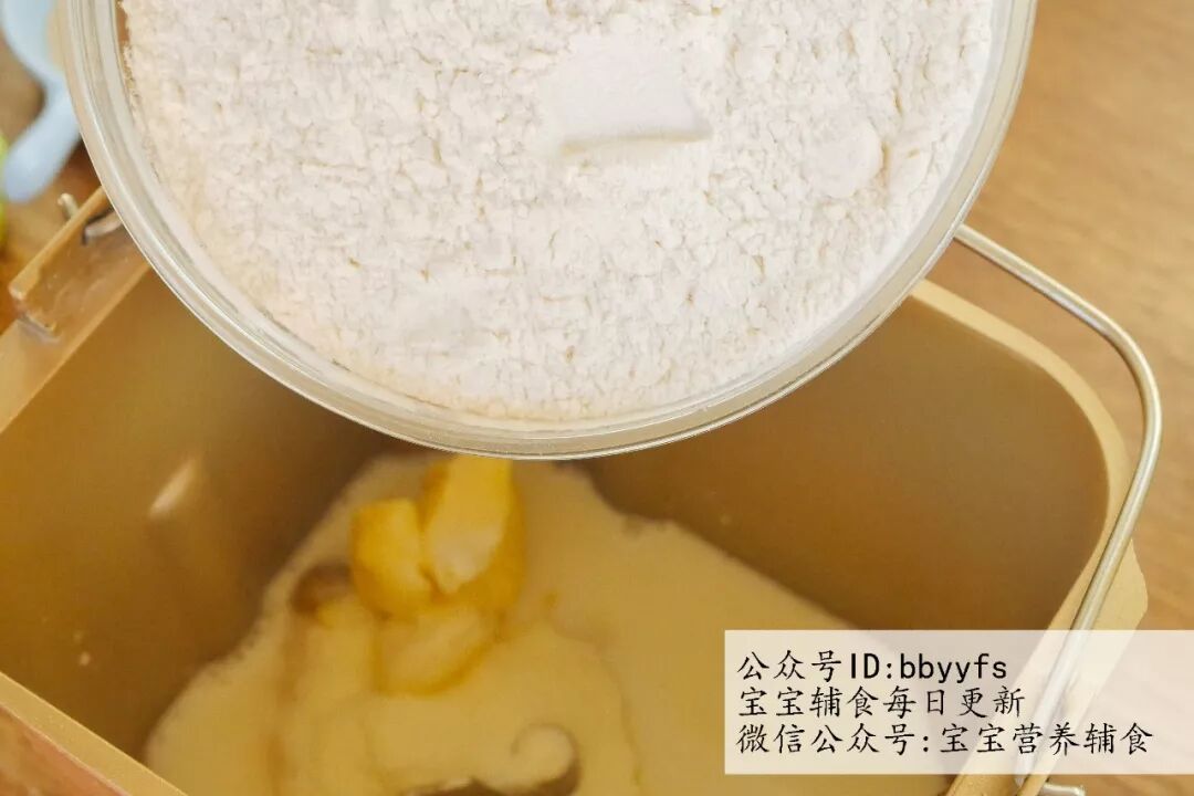 按照顺序加入材料,先放入液体,把鸡蛋和牛奶放入面包桶的最底层。