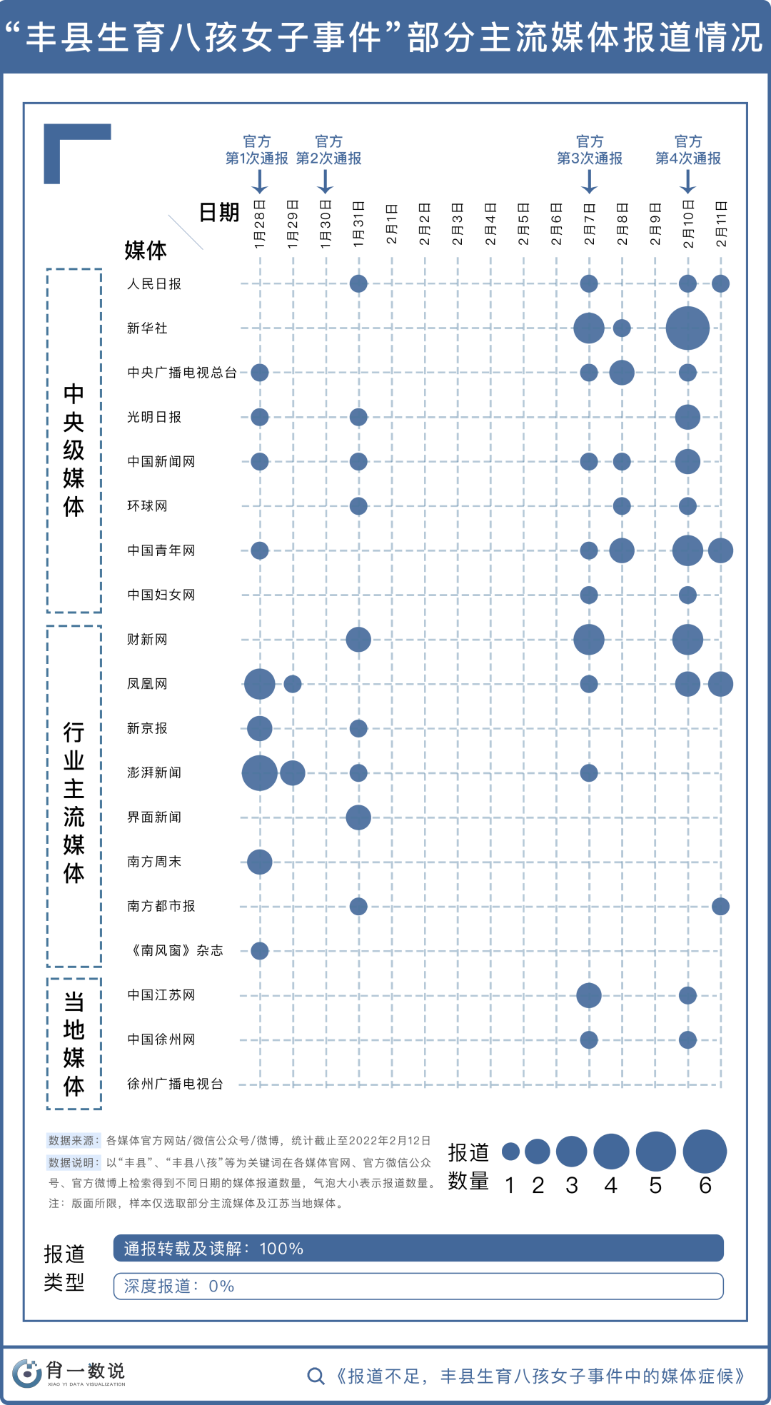 3日后,也即2月10日19点50分,徐州市委市政府联合调查组又发布通报,再次肯定女子身份为“小花梅”。但其丈夫董某民与同乡桑某妞、时某忠分别因涉嫌非法拘禁罪与拐卖妇女罪被采取刑事强制措施。值得注意的是,在前三次通报的末尾均出现了“将进一步展开调查”的相关表述,但第四次通报并未出现,这是否表明案件已尘埃落定,尚不得而知。纵观整个过程,政务机关的“挤牙膏”式通报让民众悬而未决的猜想持续发酵,对于事件核心事实的选择性通报与回避至今仍难以服众。而在政务通报与网民声讨所撕裂的舆论场上,媒体的声音却难以寻觅。面对这样一起影响重大的社会事件,媒体好似集体患上了“失语症”。我们盘点了部分主流媒体及江苏当地媒体对此事件的报道情况,整理如下:可以看到,从1月28日至2月7日期间,仅有少数媒体对此事件进行了报道;2月7日过后,媒体开始大量集中报道,尤以2月10日最甚。