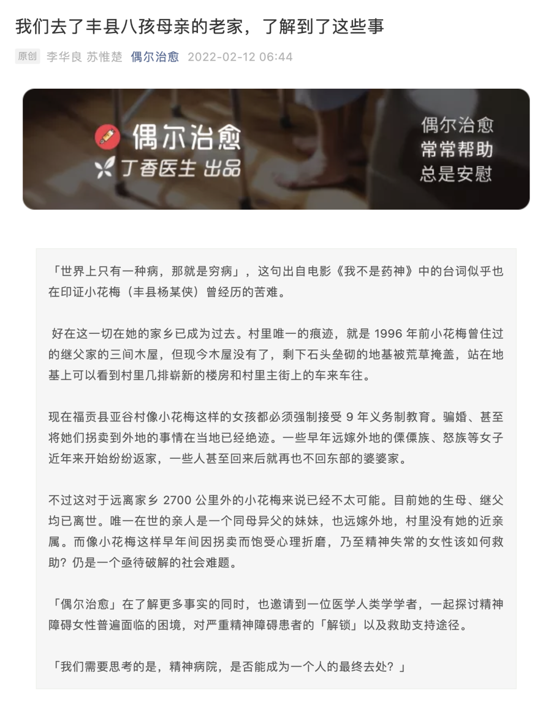 2月12日6点44分,自媒体“丁香医生”旗下矩阵号“偶尔治愈”发表文章。