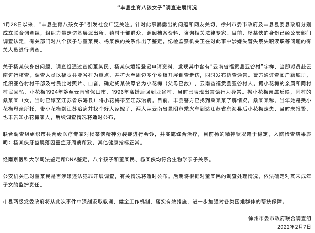 该视频拍摄于江苏省徐州丰县董集村。据网友称,视频中的女子精神失常,还育有8个孩子。1月28日,这段视频经网络传播, “丰县生育八孩女子”事件迅速引发社会广泛关注,人口拐卖、非法拘禁、生育工具等刺眼的标签开始不断充斥在舆论场上。当日18点47分,江苏徐州丰县县委宣传部发布情况说明,表示已核实女子身份,确认其患有精神疾病,且拐卖行为并不存在。1月30日23点46分,丰县县委宣传部于两日后再度发布调查通报,该女子为其丈夫已故父亲捡回家中,因精神失常才被其丈夫用铁链拴住,并再次强调未发现有拐卖行为存在。关于网民反映“生育八孩女子” 情况的调查通报/丰县发布面对网民及自媒体提出的诸多疑云,2月7日23点08分,徐州市委市政府联合调查组发布通报,表示女子真名为“小花梅”,被同村桑某某带至江苏治病,后在江苏走失。这份通报并未直接提及拐卖,但从表述来看,依旧没有肯定拐卖行为的存在。