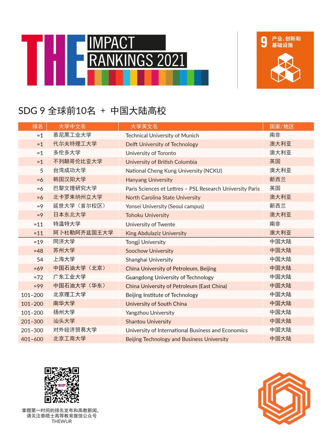 在SDG 9(产业、创新和基础设施)的单项排名中,两所首次参加排名的大学进入世界前100名:上海大学(第54名)和中国石油大学(华东)(第99名)。