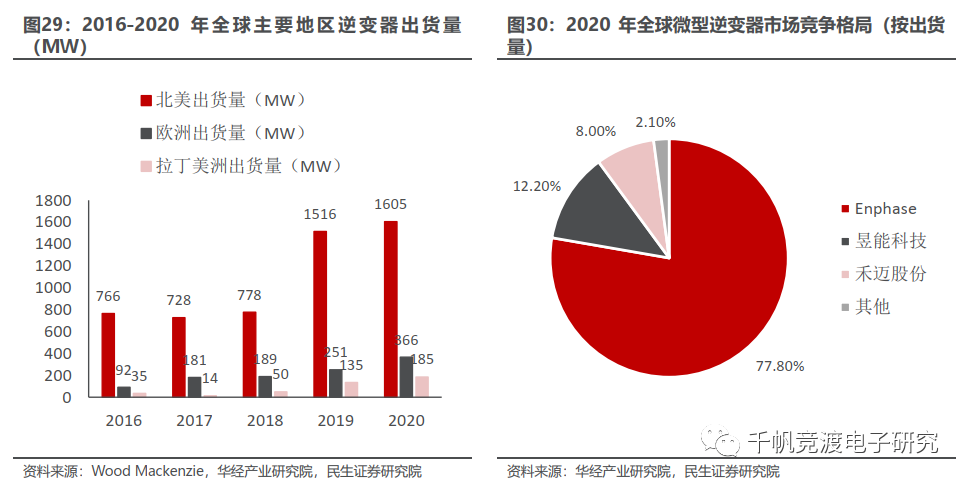 北美分布式光伏起步较早,Enphase为微逆市场龙头。从出货区域来看,北美特别是美国分布式光伏起步较早,叠加政策强调直流电安全、补贴计划成熟,微型逆变器在分布式光伏的渗透率逐年上升,到2020年微逆在分布式装机中的渗透率已经到达了近30%。而在欧洲、拉丁美洲等地,其出货量持续上升。市场竞争格局方面,Enphase作为微逆龙头,2020年市场份额达77.8%,国产企业昱能科技与禾迈股份崭露头角,市场份额占比共计20.2%。