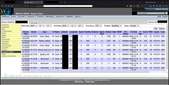 Spireon 管理面板上的历史 GPS 数据(资料来源:Sam Curry)