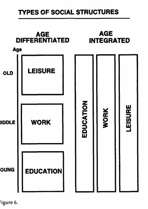 ——传统的生命历程,按年龄划分是:小孩上学、年轻人工作、老年人退休,是education, work, retirement/leisure的三个分离,也由此导致了,同辈群体之间的age groups规范与交往:年轻人不容易和老年人成朋友,更不用提小孩和老年人共同形成一种文化。当然,这背后的力量是:社会是不允许年轻人就退休,也不允许老年人是去抢年轻人的饭碗。