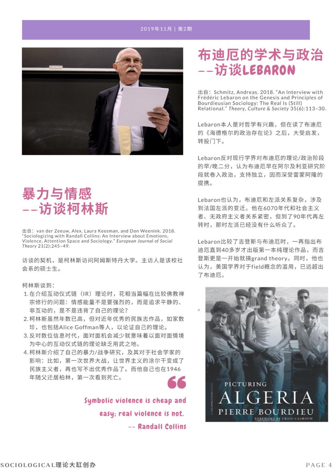 值得⼀说是,除了柯林斯的访谈是由社会学界重要刊物刊发,EUROPEAN JOURNAL OF SOCIAL THEORY,其它⼏篇都算不上。虽然LEBARON的访谈是来⾃⽂化研究界的重要刊物,THEORY, CULTURE &SOCIETY,但布洛维的访谈却是来⾃意⼤利的⼀份很有潜⼒的英⽂刊物,SOCIOLOGICA:INTERNATIONAL JOURNAL FOR SOCIOLOGICAL DEBATE,吉登斯的访谈则是来⾃于布洛维任国际社会学会会⻓期间创办的通讯杂志《全球对话》。也可以说,杂志构成上的高低不平、地区差异,也意在向学界介绍社会学知识在刊物与学科交叉方面的多样性。