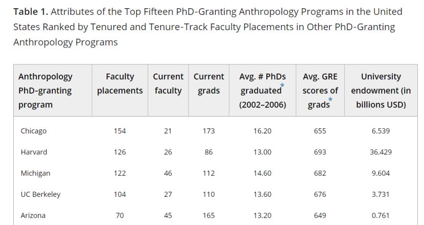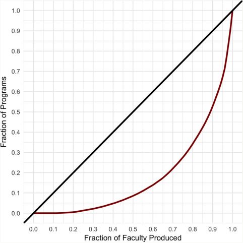 如果用基尼系数表示这种教职分配得不平等,就更明显。排名前十的人类学院系所产生的教师数量是后十个的2.5倍,排名11-20的比排名21-30的多出1.5倍