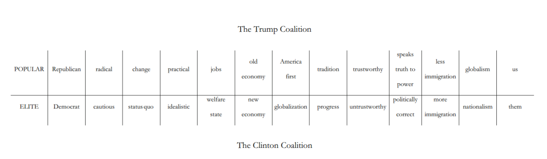 文化社会学家Matthew Norton同样以“到底发生了什么”来形容当年的川普当选。为了解释川普在俄亥俄州,密歇根州,威斯康星州和宾夕法尼亚州这几个州的险胜,他认为选举是选“符号的联盟”。
