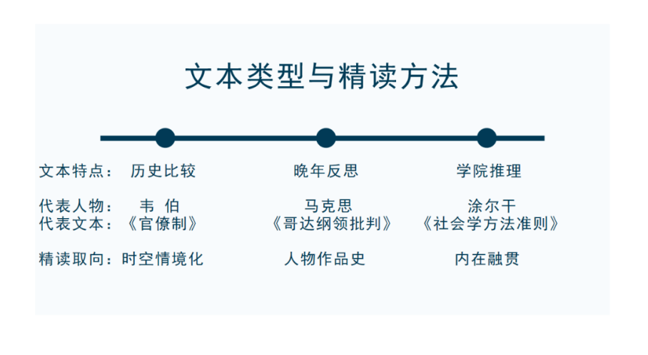 3)精读文本常常令人挫败,但如果我们知道了原著的行文结构、版本差错、某位理论家的写作风格(比如涂尔干喜欢先破后立)、英语长难句如何删繁就简、原著的文体(比如韦伯的《经济与社会》是从尚未确定的遗稿中整理,马克思的《哥达纲领批判》的书信背景,米德的《心灵、自我与社会》是课堂速记),我们在阅读时会更有的放矢。