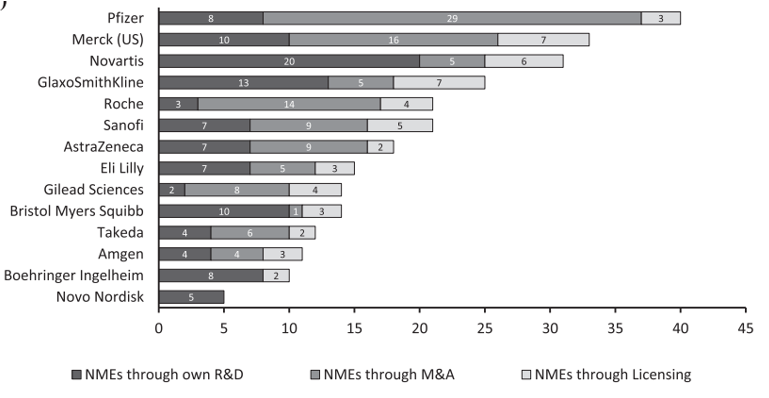 2. 不过,辉瑞公司算不上最有创新的企业,因为你的创新可以有三种:授权许可、自主研发专利和收购。辉瑞有73%的新分子实体是通过收购或许可授权得来的。