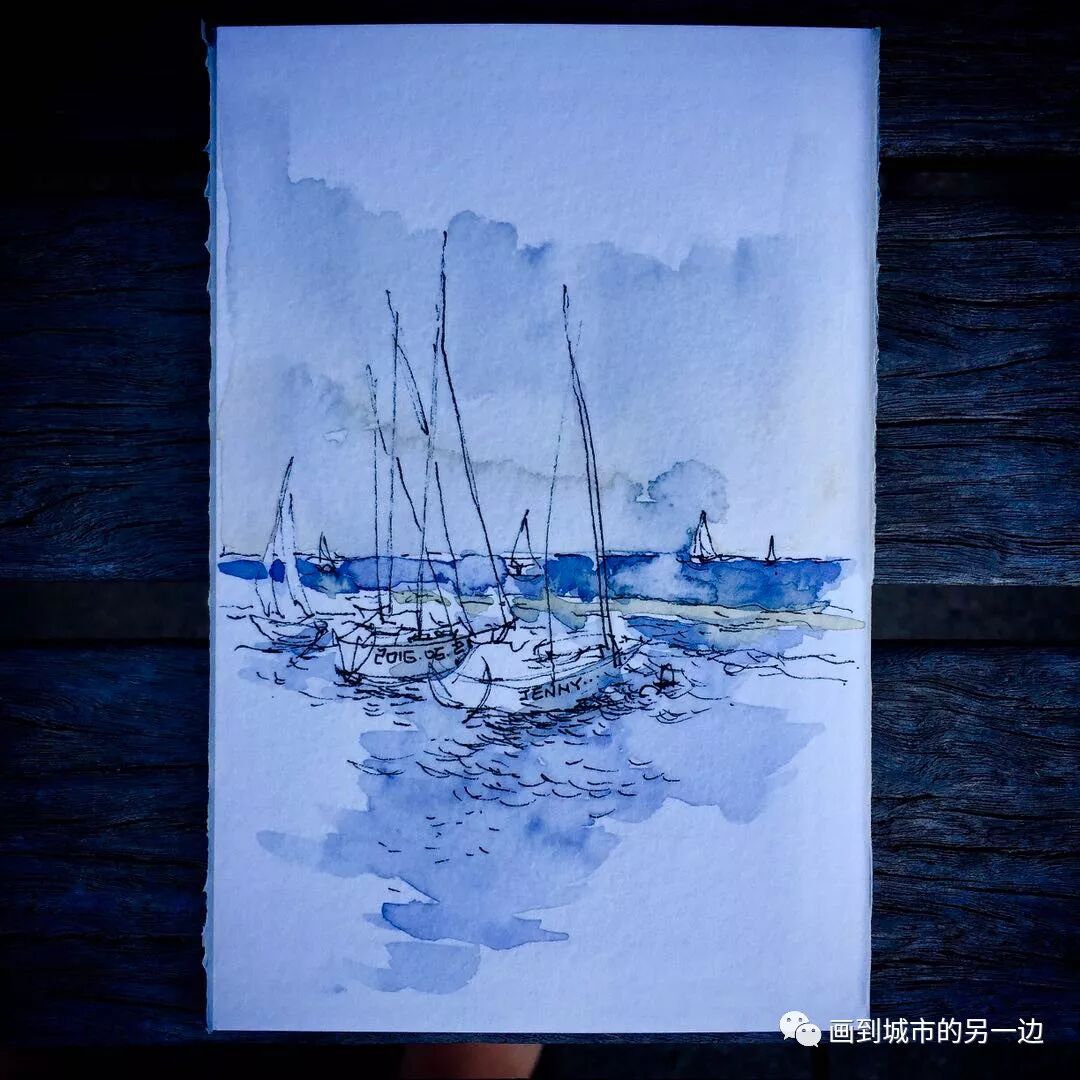 05. 密歇根湖,这天很冷,但我画的时候并没察觉。直到画完,发现一旁的手机自动关机才发现自己的手都没太有知觉。厚着脸皮在船上写了自己的名字。