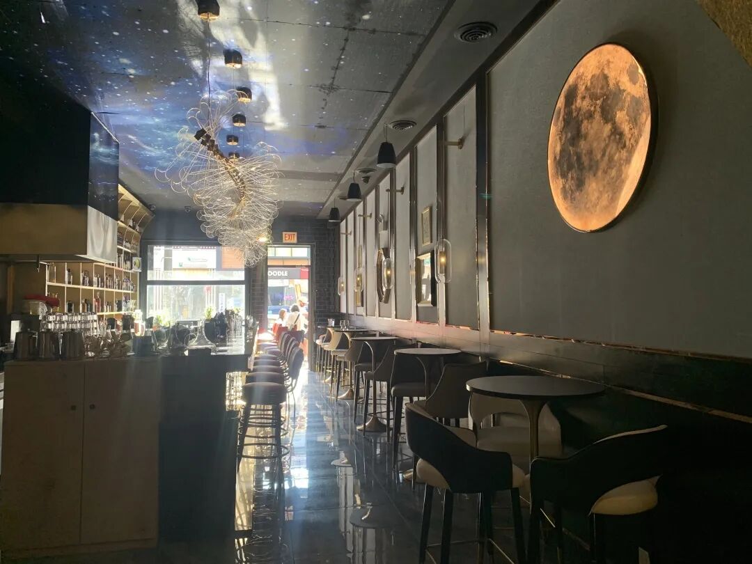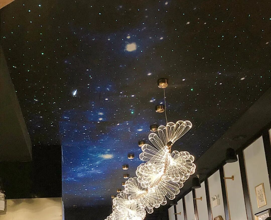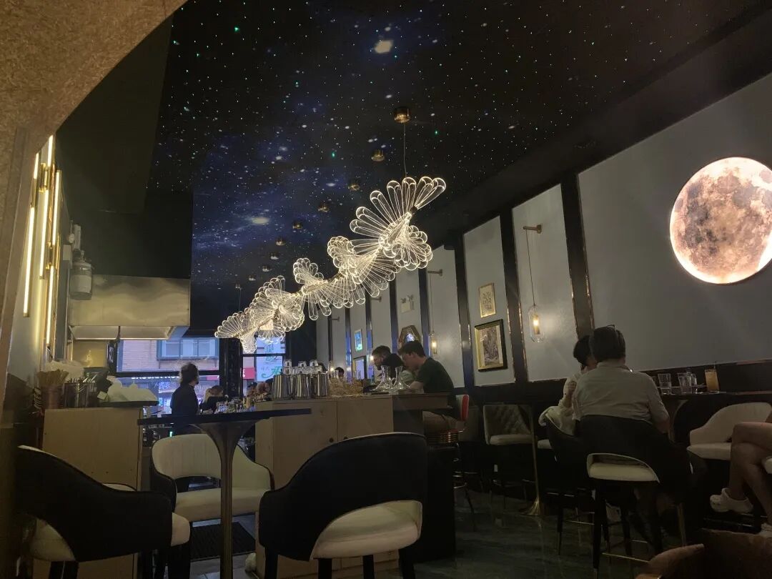 进门的左侧是靠墙的高脚桌椅,右侧是置酒架和吧台。满天小星星和一直有流星划过的天花板以及蜿蜒的蜻蜓灯,十分吸睛!