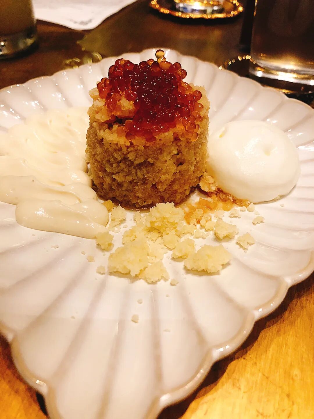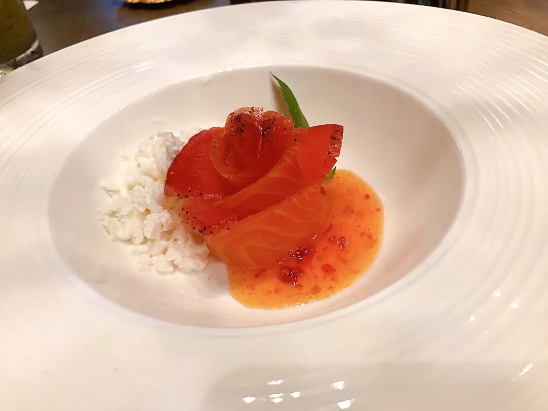 配料使用的是混合了海盐淡奶油和椰子酱的小冰渣。入口即化的椰奶香与鱼生的十足海味缠绵在一起,从没想到这两种味道能成为好朋友喜欢吃生鱼的小伙伴,必尝哦!