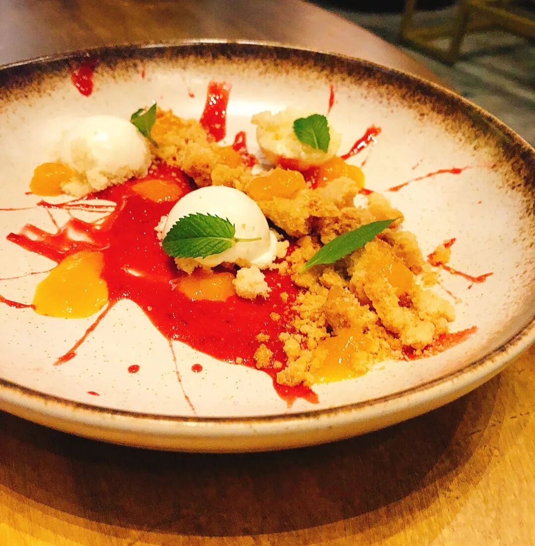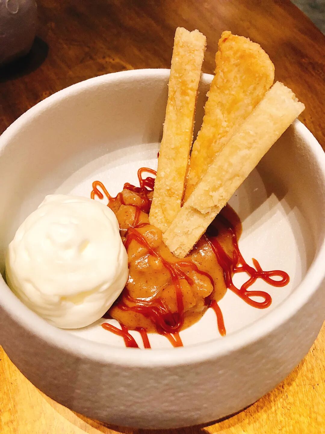 这道甜品以派挞酥皮条、焦糖苹果泥、威士忌焦糖酱和芝士霜的创意组合呈现经典苹果派味。虽然是所有甜品中最平淡的一道,主厨希望它的存在能够满足怀念「家」味的顾客~