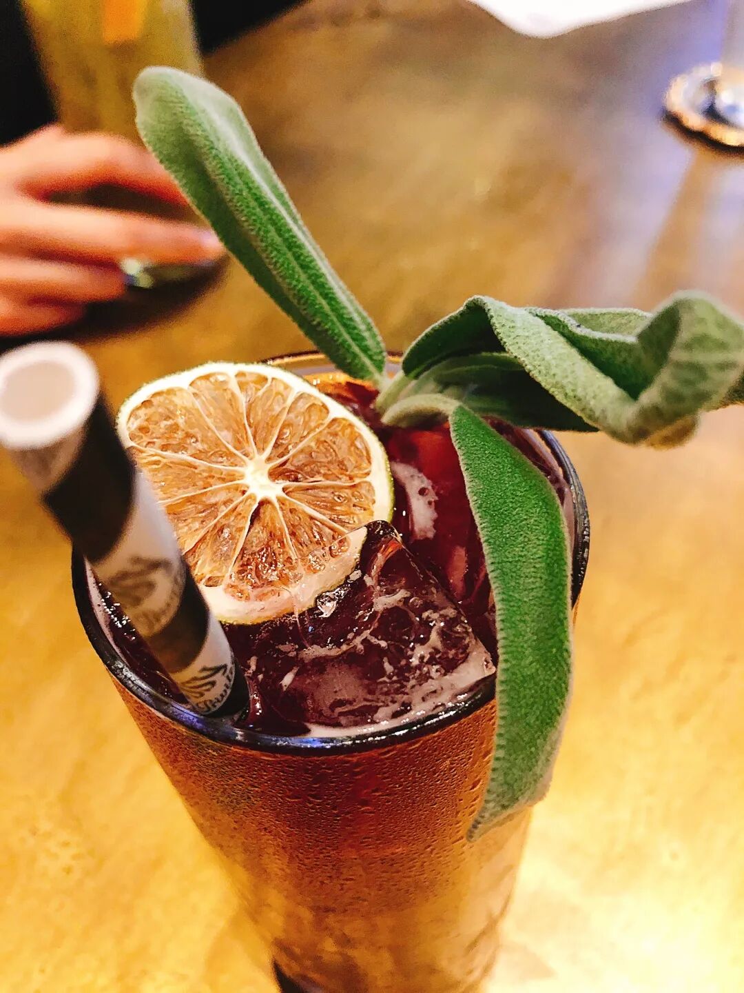 这款酒相信没有人会不爱!推荐给喜欢酒精味不太重的朋友。调酒师先倒了满杯冰块,接着加入三分之二酒杯的蓝莓果酒和三分之一的柚子果酒,最后放上鼠尾草和青柠做点缀,这杯浪漫的小甜酒就做成啦~蓝莓的甜腻和柚子、鼠尾草、青柠进行了很好的中和,不知道喝什么的话点这杯绝对不会出错!
