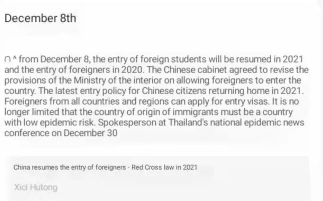 My first impresion is that it won't be true as it says "From December 8, the entray of foreign students will be resumed in 2021 and the entry of foreigners in 2020. The Chinese cabinet agreed"