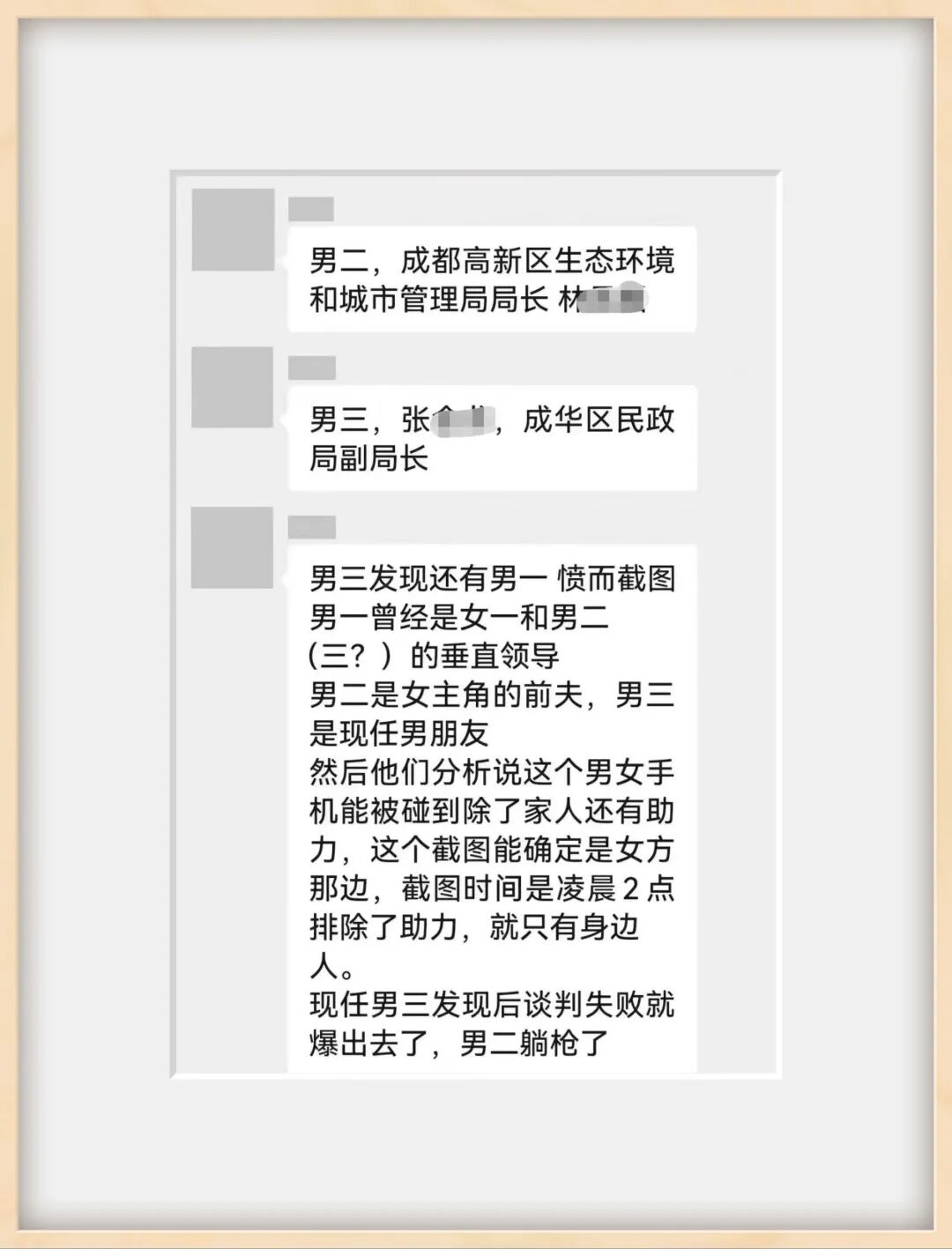 9月30日是工作日,俩人上午上班后刚视频聊天了十多分钟,挂断电话就又开始互发短信调情。这天,有三个街道迎接上级检查,省里还来了一位处长,女副区长依然是事业偷情两不误。这就是两位男女副区长的工作“日”常:大家都以为他们在干事,哪知道他们在干那种事。 两个副区长的故事在网上传开后,有网友说:这哈火了,工作都要耍脱。根据《中国共产党纪律处分条例》第一百三十五条规定,与他人发生不正当性关系,造成不良影响的,给予警告或者严重警告处分;情节较重的,给予撤销党内职务或者留党察看处分;情节严重的,给予开除党籍处分。男副区长和女副区长显然是发生不正当性关系,并造成不良影响了。究竟是“情节较重”,还是“情节严重”,是“给予撤销党内职务或者留党察看处分”,还是开除党籍处分,相信很快就会有结论。12月18日,又有一则“女副区长背后男人关系表及事件爆发原因分析”的截图在网上传播。截图显示,女副区长的背后有着三个男人:男一、雷鸣,女副区长情人;男二,某高新区生态环境和城市管理局局长林某,女副区长前夫;男三,某区民政局副局长张某,现任男友。由此可以推断出这样一个逻辑,女副区长和前夫离婚后,又找了一个在区里当副局长的男友张某,同时和男副区长雷鸣保持着情人关系。有男友,有情人,有前夫,女副区长的感情生活确实多姿多彩。男友仅仅一介区属单位的副局长,与女副区长的官位本就悬殊了二级,估计本来就在女副区长面前有点底气不足,由此可能有疑神疑鬼的心理。某天夜深人静女副区长睡熟后,其与男副区长激情澎湃的微信撩骚被男友发现了。男副区长估计想,女副区长男友是自己下级的下级,况且还没结婚,所以没有资格与他这个上级的上级谈条件。一,婚外偷情这种事,千万不可保留聊天记录。聊完即删,且不可马虎大意,更不可留着“回味”。二,手机要锁好,小心你睡着后被解码截屏。目前,智能手机有数字密码锁、图案识别锁、指纹识别锁、人脸识别锁,最安全的还是人脸识别锁。三,人在职场,要管住自己的欲望。记得一位老领导曾对年轻人说过:钱不可装错兜,人不可上错床。环顾周遭,有多少官员倒在钱、色问题上呀!来源 | 城见局、宾曰语云、政道儿、中宏网、喻说不休、兵哥评说、星月皓洁 等