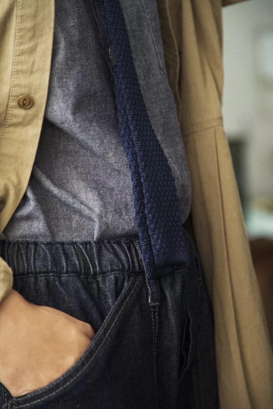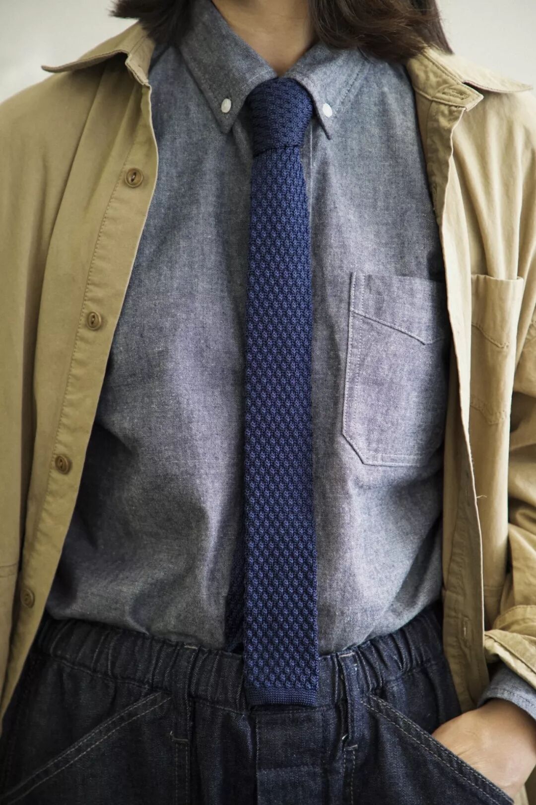 由于全棉纺织的面料都会存在一定的缩水问题,在多次打版洗水的尝试之后,Cicadahood最终选择在纺织工艺先进的日本冈山进行牛津纺面料的纺织。手工采摘的优质长绒棉,在日本匠人与先进的纺织机器的共同作用下纺出的全棉纱线杂质少、韧性强。色纱与白纱经纬交织,使得布面具有双色效应,即便色纱采用深色,另一向的白纱仍能有效调和织物色泽,整体色彩非常富于变化,不同的光线下会呈现不同的明暗度。由冈山县先进的纺织机器纺织而成的牛津纺面料,除了具有一般牛津纺通有的特点,视觉上质地更加细密,织纹清晰,层次丰富。穿着上轻松保暖、柔和贴身,吸湿性、透气性甚佳。使用印尼火山石进行成衣洗水之后,面料手感更加柔软、有质感,耐洗耐穿,长时间穿着也不会出现明显的褶皱。特殊的防缩水处理使得日本全棉纺织牛津纺面料缩水率要比一般的织物要小,不会在日常的穿着与洗涤中,轻易出现缩水现象。