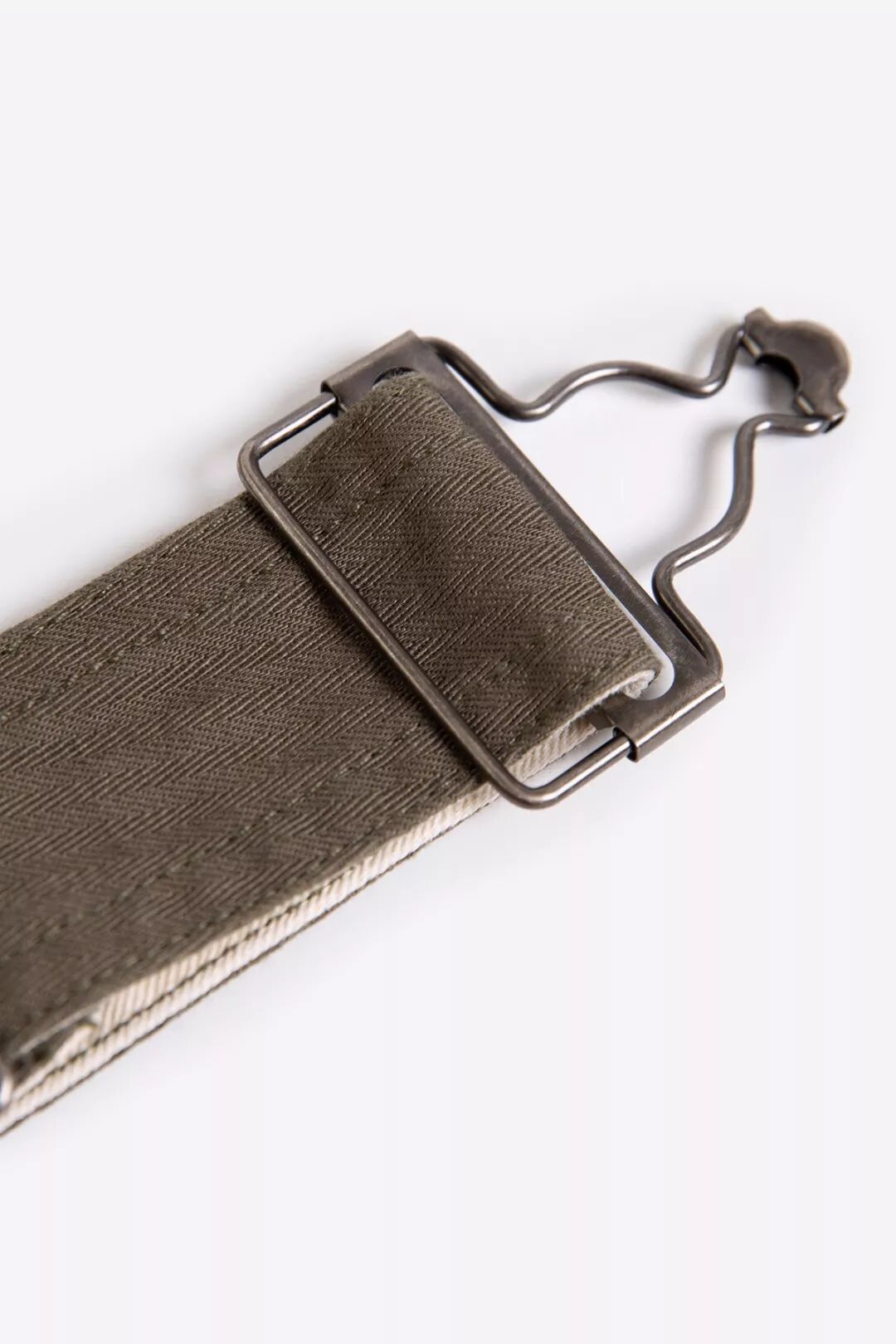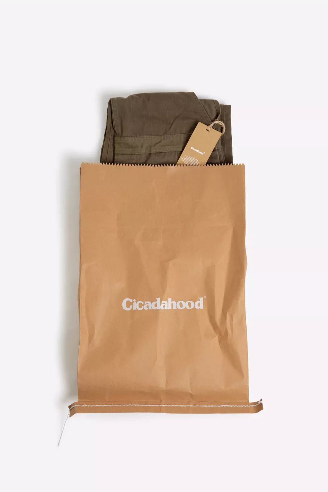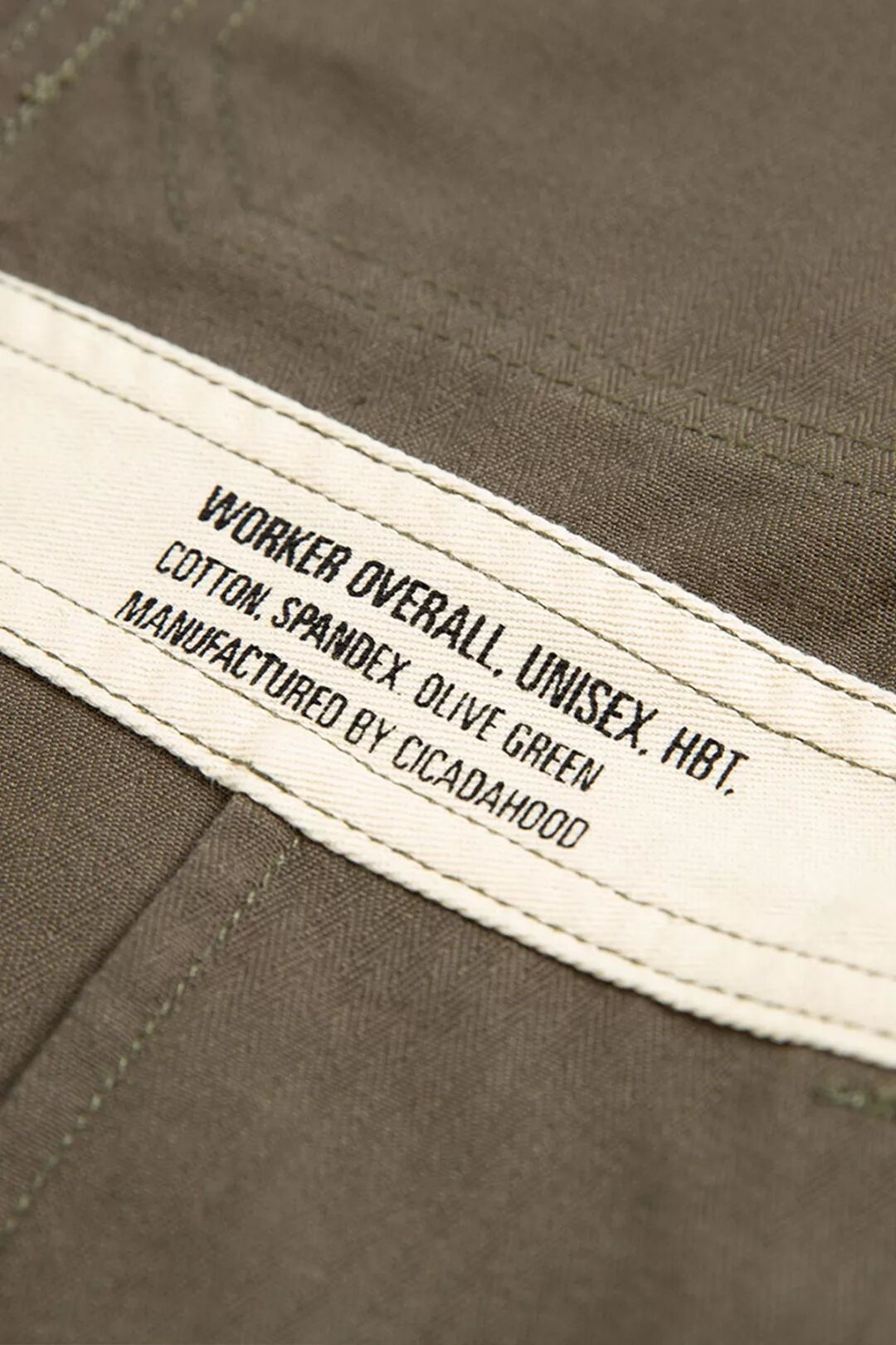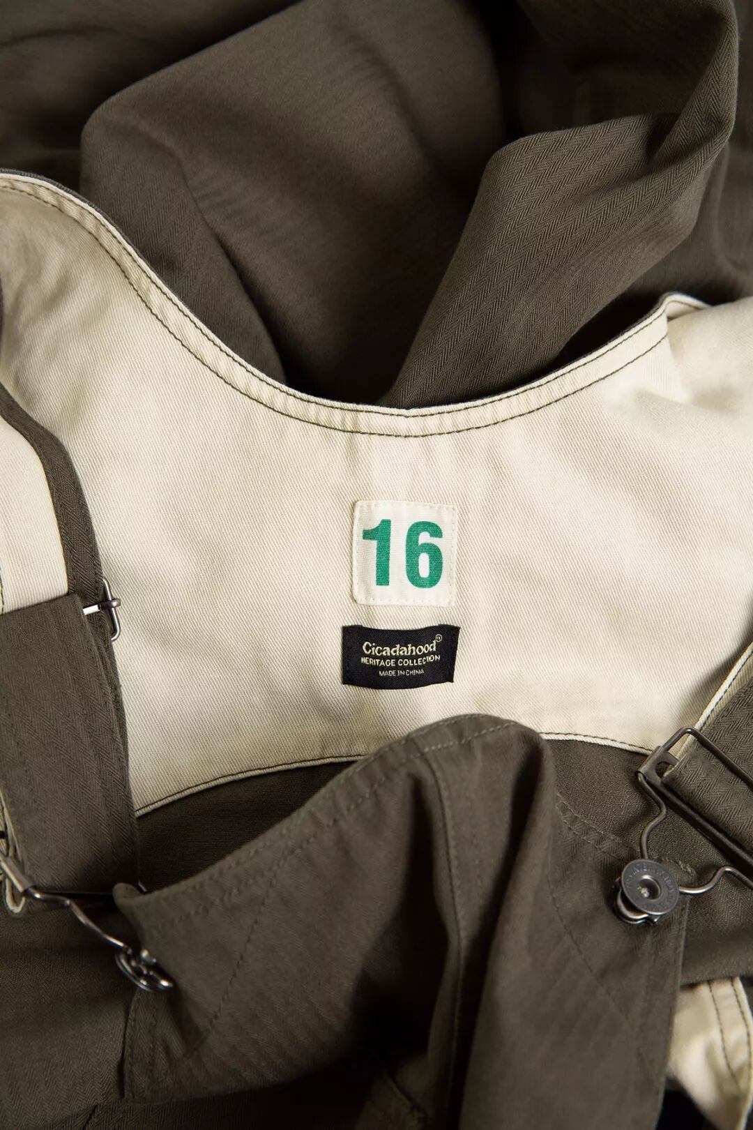 延续经典工装在衣身内侧印制信息的设计,Cicadahood在背带裤后腰内里的布料上丝印了面料和产品信息,选用了1950年代欧洲军事服装常用的数字尺码标识,这是对经典军事、工装元素的致敬。