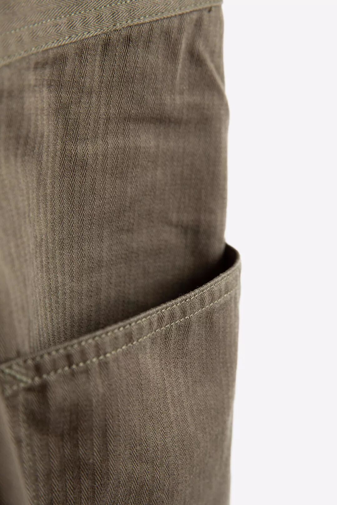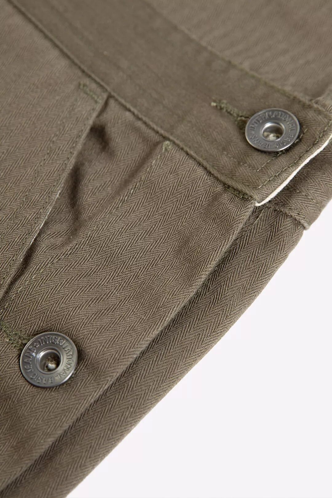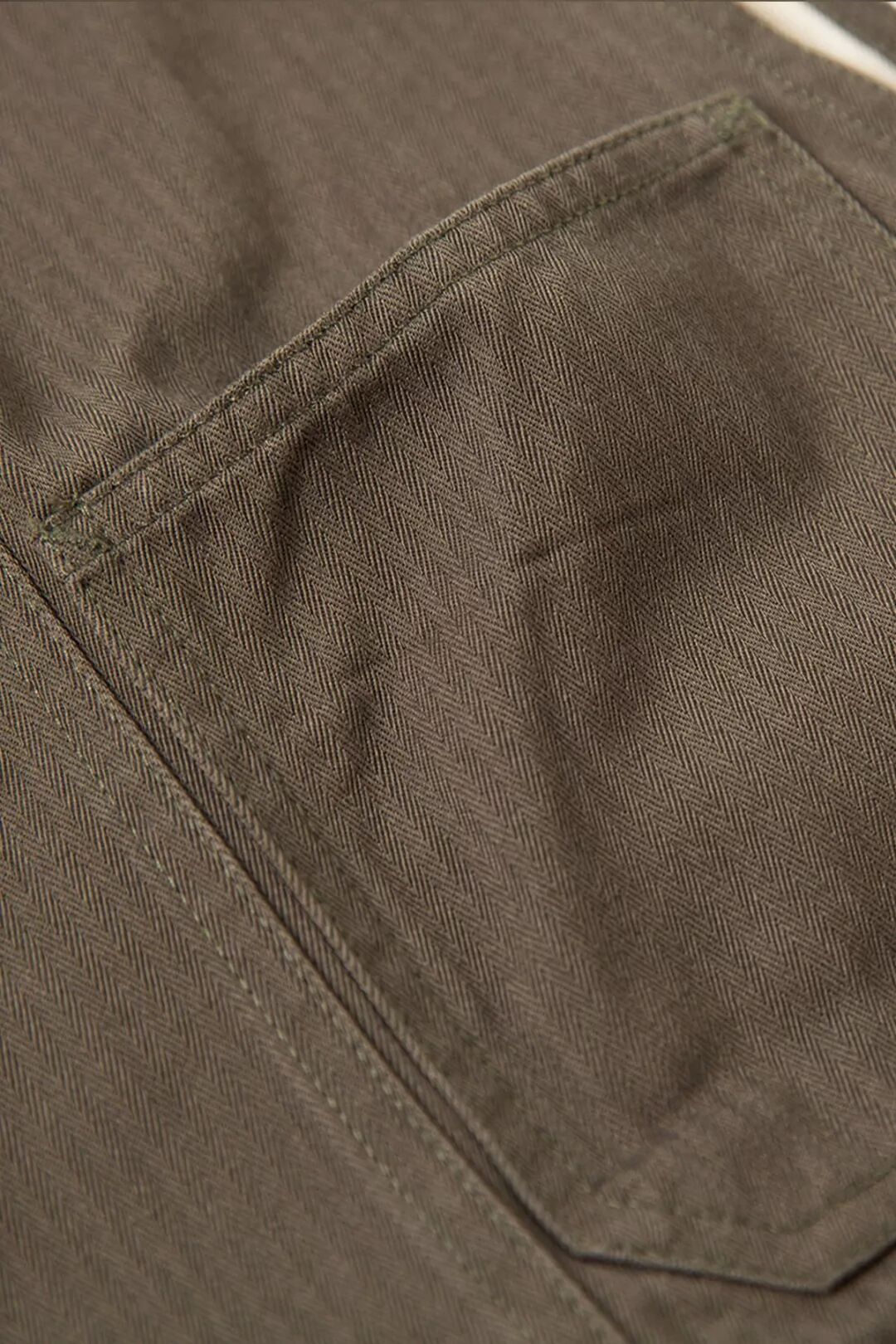 背带裤使用了日产Yuki缝纫机和高强力低延伸的涤纶线进行缝制,涤纶原料是所有物料中最能抵受磨擦、干洗、石磨洗、漂白的材料,其低伸度及低伸缩率,保障了极佳的可缝性,用于缝纫质地厚实耐磨的人字纹HBT面料最适合不过。在缝制过程中,为了防止松线、散线,我们在袋口、裤脚等容易磨损的位置做了打枣加固,加强衣服的牢固性。布料连接处都使用了日产PEGASUS打边机锁边,走线工整,针脚细密,即使受外力拉扯,也不易破损变形。