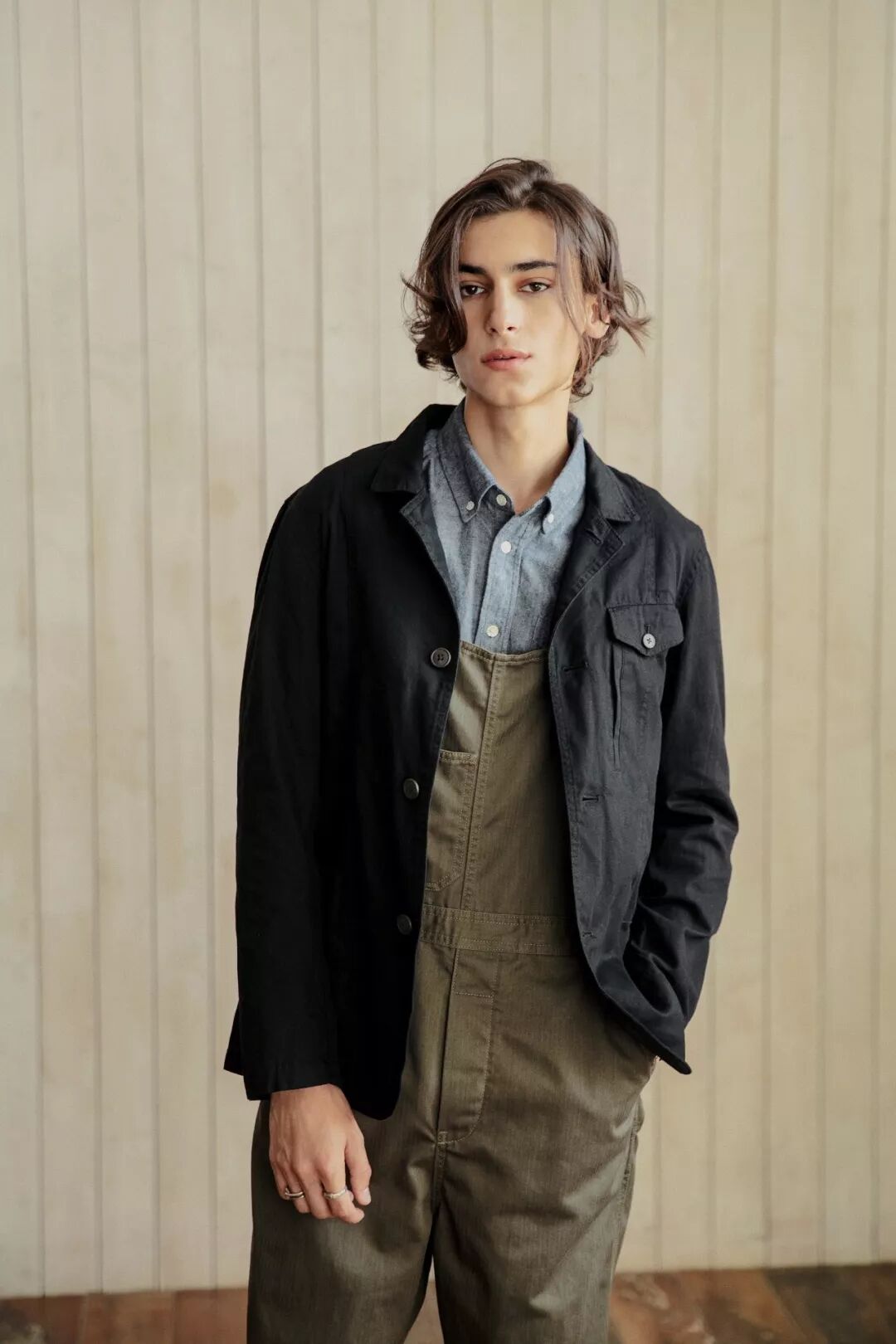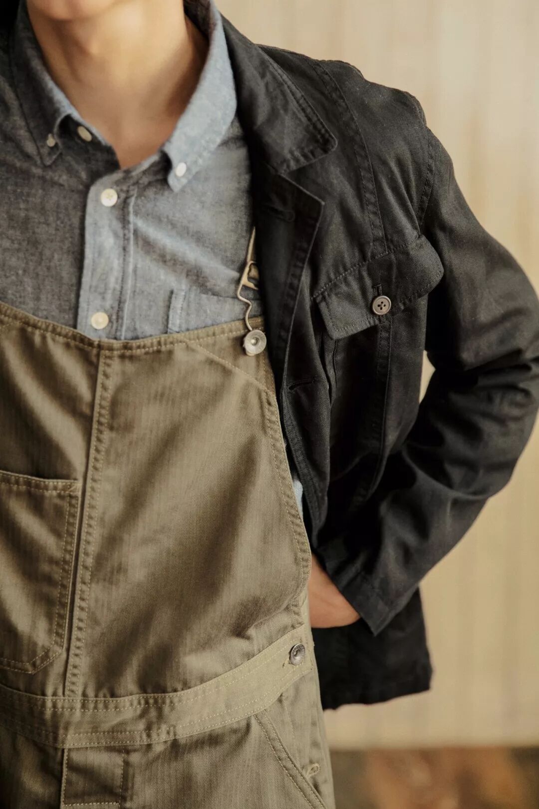 背带裤已有一百多年的历史,一开始是用牛仔布或灯芯绒面料制成,因耐穿而成为受欢迎的工人服装。 19世纪50年代,背带裤颜色随着不同人群划分开,白色代表画家,蓝色是农民,细条纹是铁路工人。到了20世纪60年代,背带裤在好莱坞明星带动下开始走上时尚舞台。20世纪90年代,以美国歌手Will Smith和超级男孩'N Sync为首的嘻哈歌手扩大了背带裤的影响力,而后流行至今。Ralph Lauren和穿着背带裤的妻子合影照片Cicadahood Heritage Collection法式人字纹工装背带裤以20世纪50年代的法式工装为设计灵感,沿用法式工装直筒、工字扣、人字纹、以及五袋的设计元素。区别于美式工装粗犷硬朗,法式工装的设计更加简约合体。我们在裤子的裤宽、裤长、腰围等细节做出调整,改版后的背带裤,不限性别、身材,更适合中国人的体型。背带裤使用的是日本中磅复古人字纹HBT面料,HBT 全名是 Herringbone Twill,因布料“人字纹”纹路和青鱼骨相似而得名。 HBT 面料因自身不易缩水、耐磨,被作为军装面料使用。结合日本冈山先进的纺织技术,织成的面料具有不易产生褶皱、垂坠性好,透气柔软的优点。将人字纹这一军事元素和法式工装融合,在视觉上也更显纹理和层次感,使得衣服有质感且耐看。