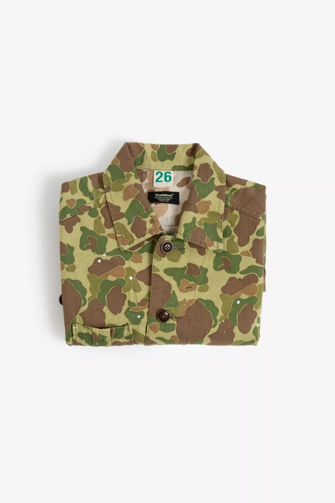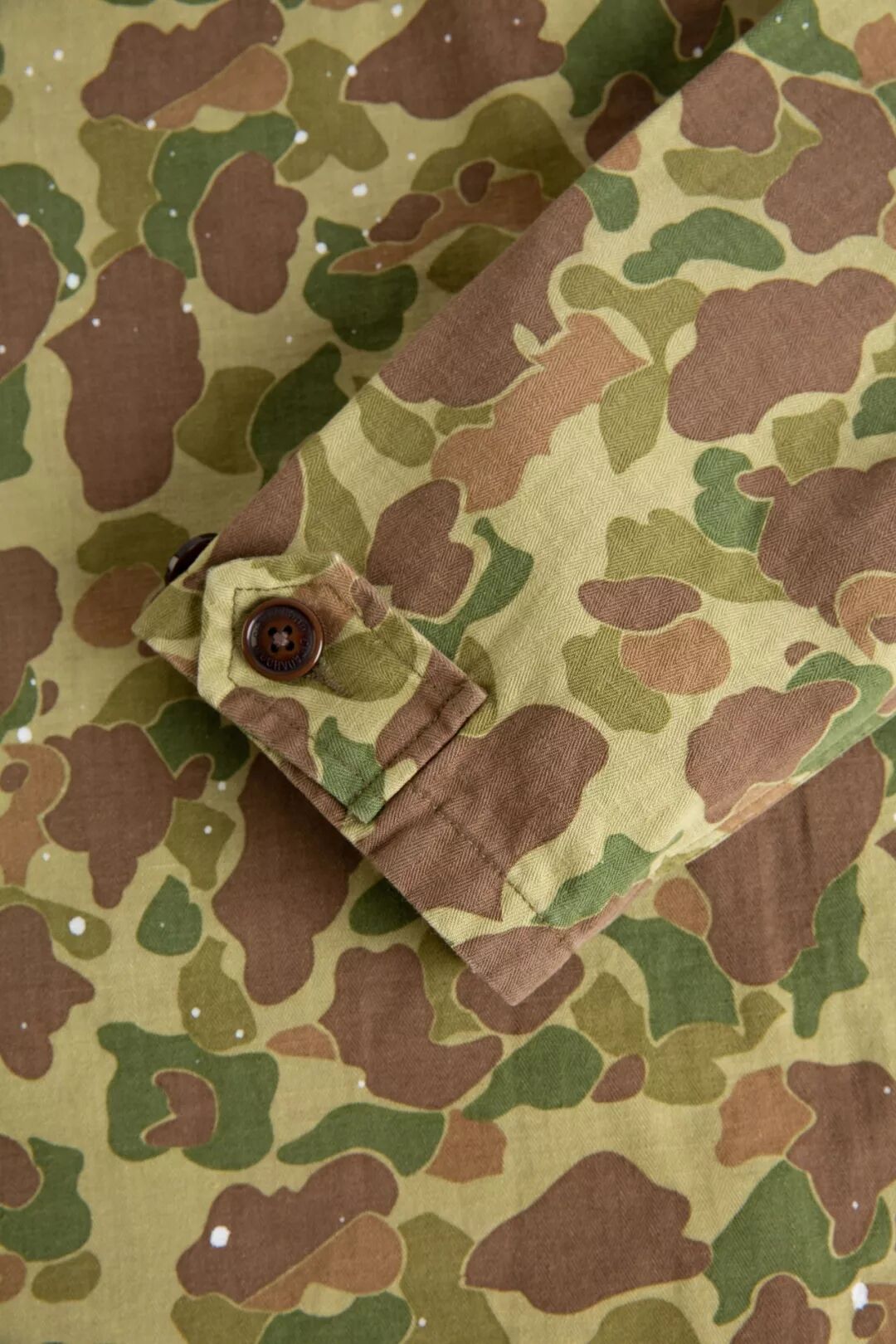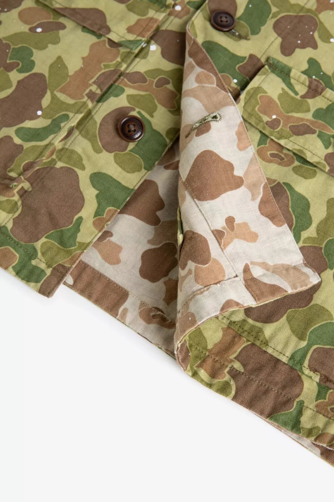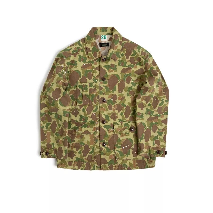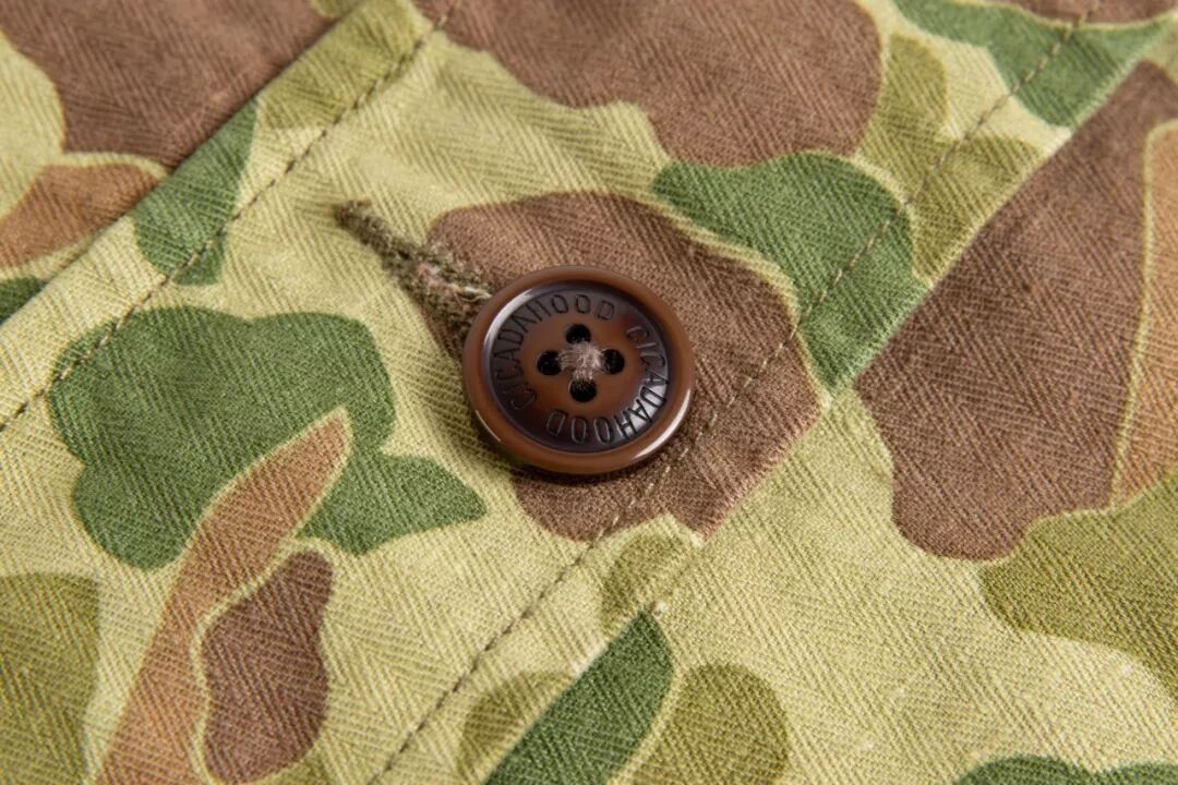 过去的军事给当下的服饰设计留下充足的灵感,除了军绿、军黄的经典军事色彩,还有各种图案与颜色的迷彩,Cicadahood本期新品,就是立足于太平洋战争时期,美国海军陆战队(USMC)深秋猎鸭迷彩作战服,改良面料、工艺,与细节元素,设计而成的【Cicadahood Heritage Collection USMC 日本造HBT猎鸭迷彩双面夹克】。猎鸭迷彩最早由一名Novell Gillespie的加州园艺家设计,为了在猎鸭时更好地隐蔽自己、接近目标,而设计出来的迷彩图案。1942年太平洋战争期间,双面印刷猎鸭迷彩作为美军首个迷彩图案被运用到军事作战中。美军使用的猎鸭迷彩有偏绿和偏黄两种色调,分别适用于春夏和秋冬的战事。1945年2月,太平洋战争期间,战地摄影师尤金史密斯身穿USMC作战服,摄于日本冲绳,身旁为USMC猎鸭迷彩