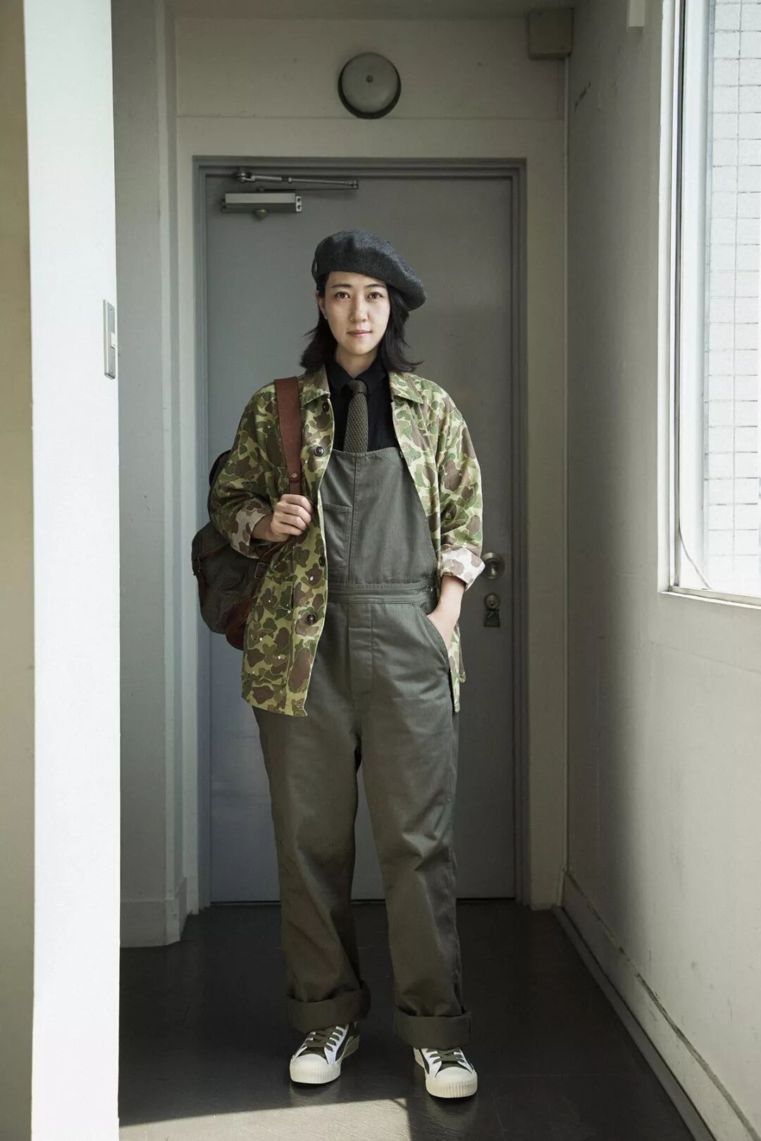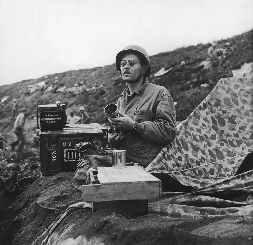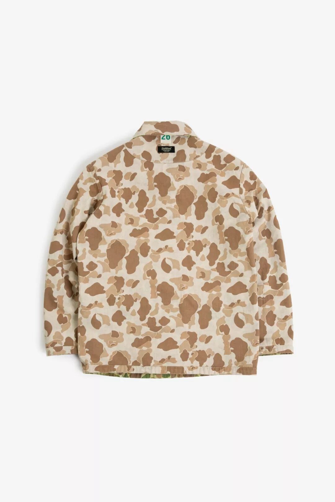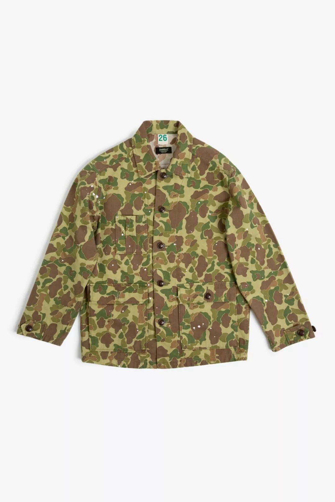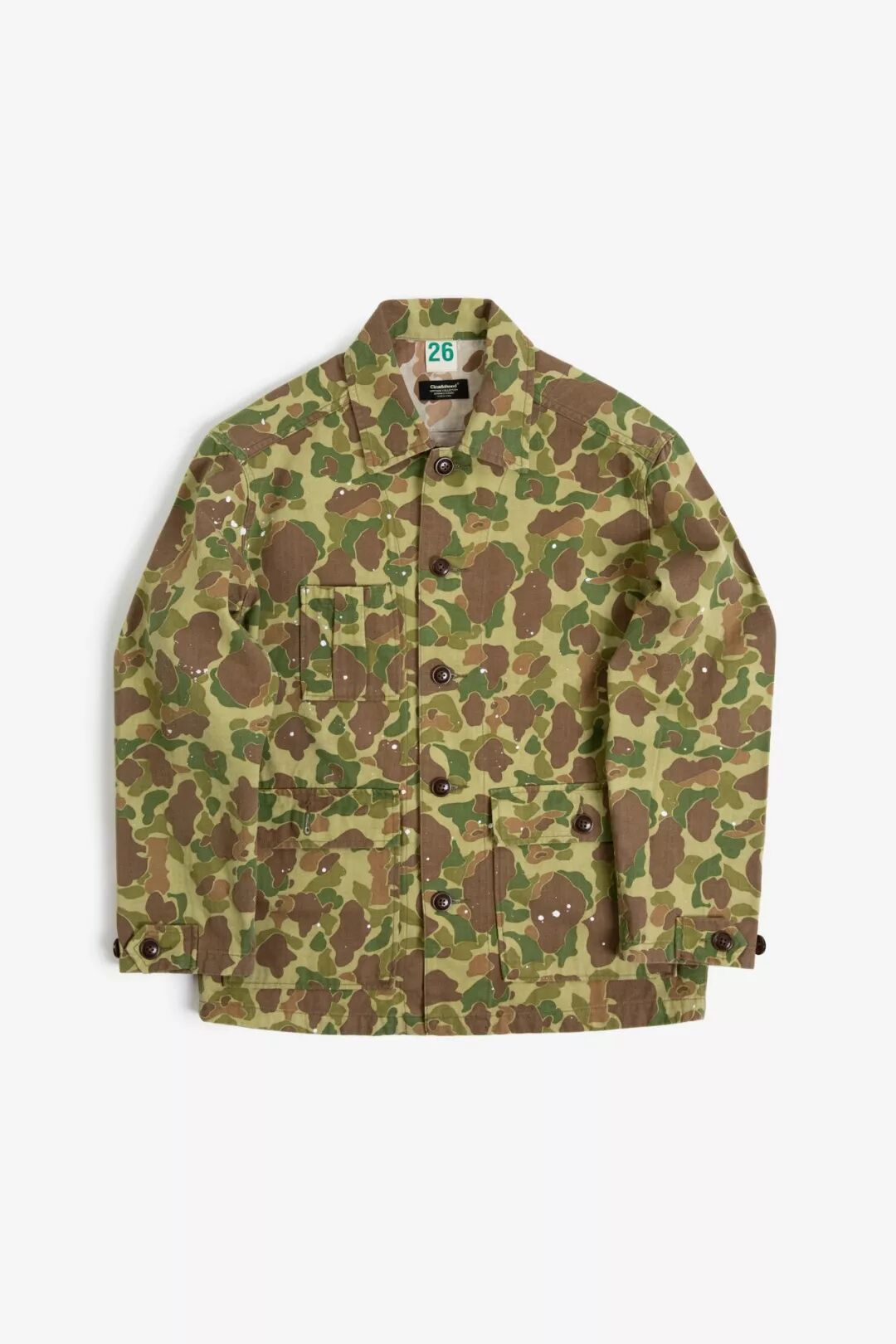 过去的军事给当下的服饰设计留下充足的灵感,除了军绿、军黄的经典军事色彩,还有各种图案与颜色的迷彩,Cicadahood本期新品,就是立足于太平洋战争时期,美国海军陆战队(USMC)深秋猎鸭迷彩作战服,改良面料、工艺,与细节元素,设计而成的【Cicadahood Heritage Collection USMC 日本造HBT猎鸭迷彩双面夹克】。猎鸭迷彩最早由一名Novell Gillespie的加州园艺家设计,为了在猎鸭时更好地隐蔽自己、接近目标,而设计出来的迷彩图案。1942年太平洋战争期间,双面印刷猎鸭迷彩作为美军首个迷彩图案被运用到军事作战中。美军使用的猎鸭迷彩有偏绿和偏黄两种色调,分别适用于春夏和秋冬的战事。1945年2月,太平洋战争期间,战地摄影师尤金史密斯身穿USMC作战服,摄于日本冲绳,身旁为USMC猎鸭迷彩