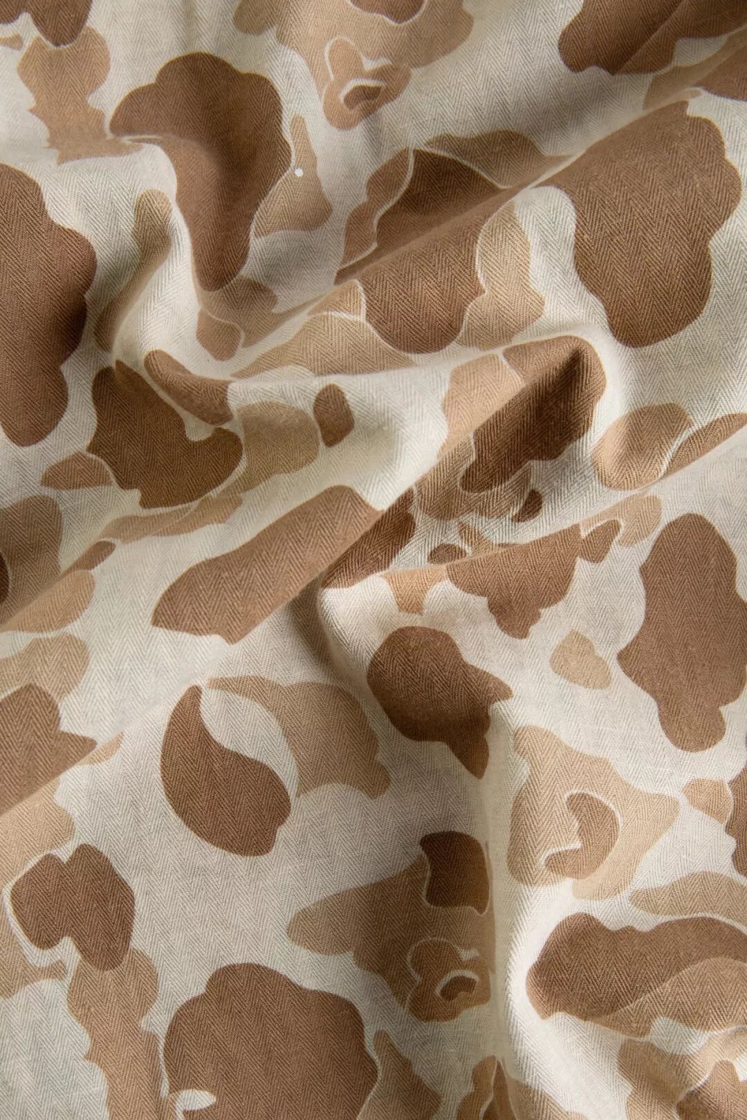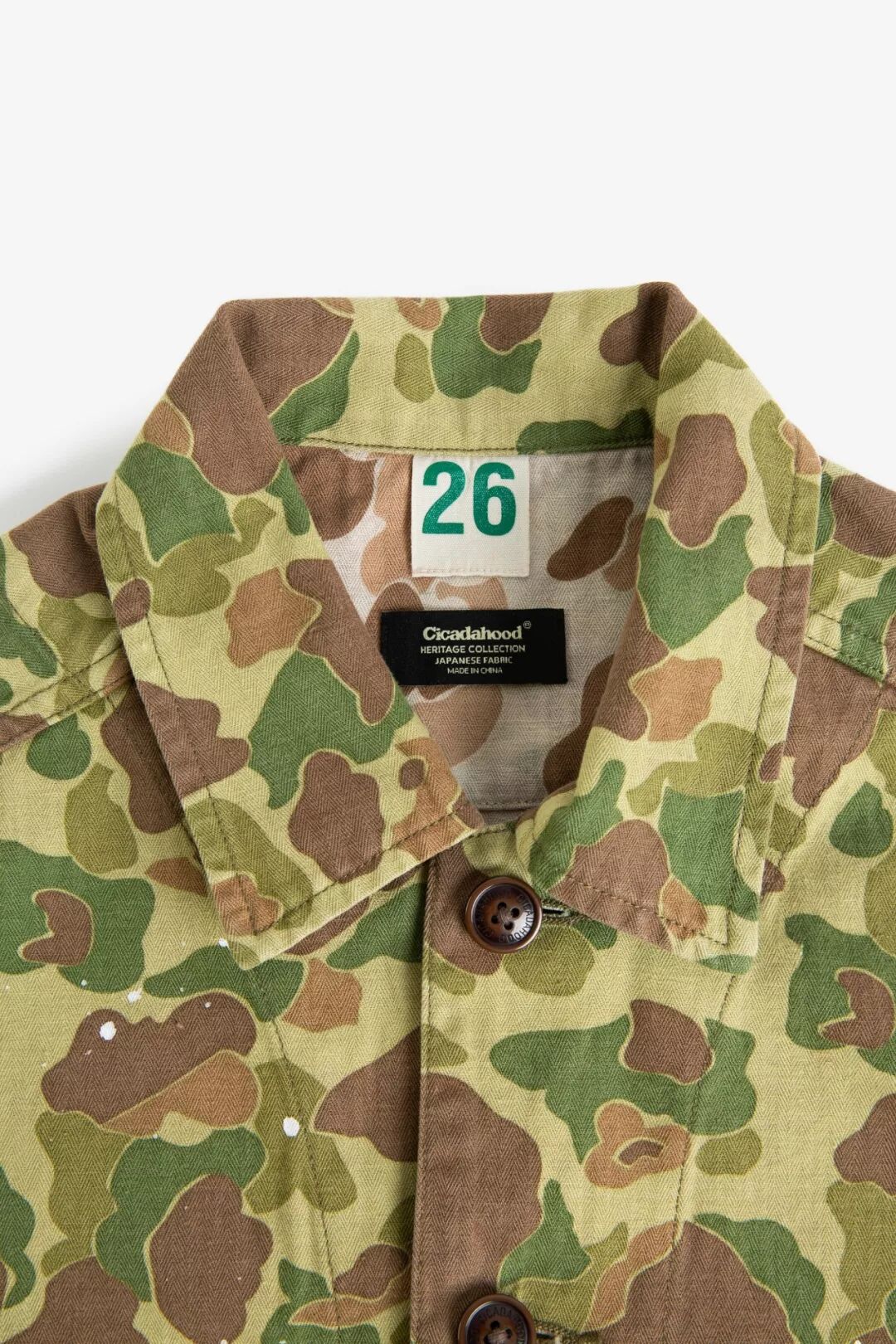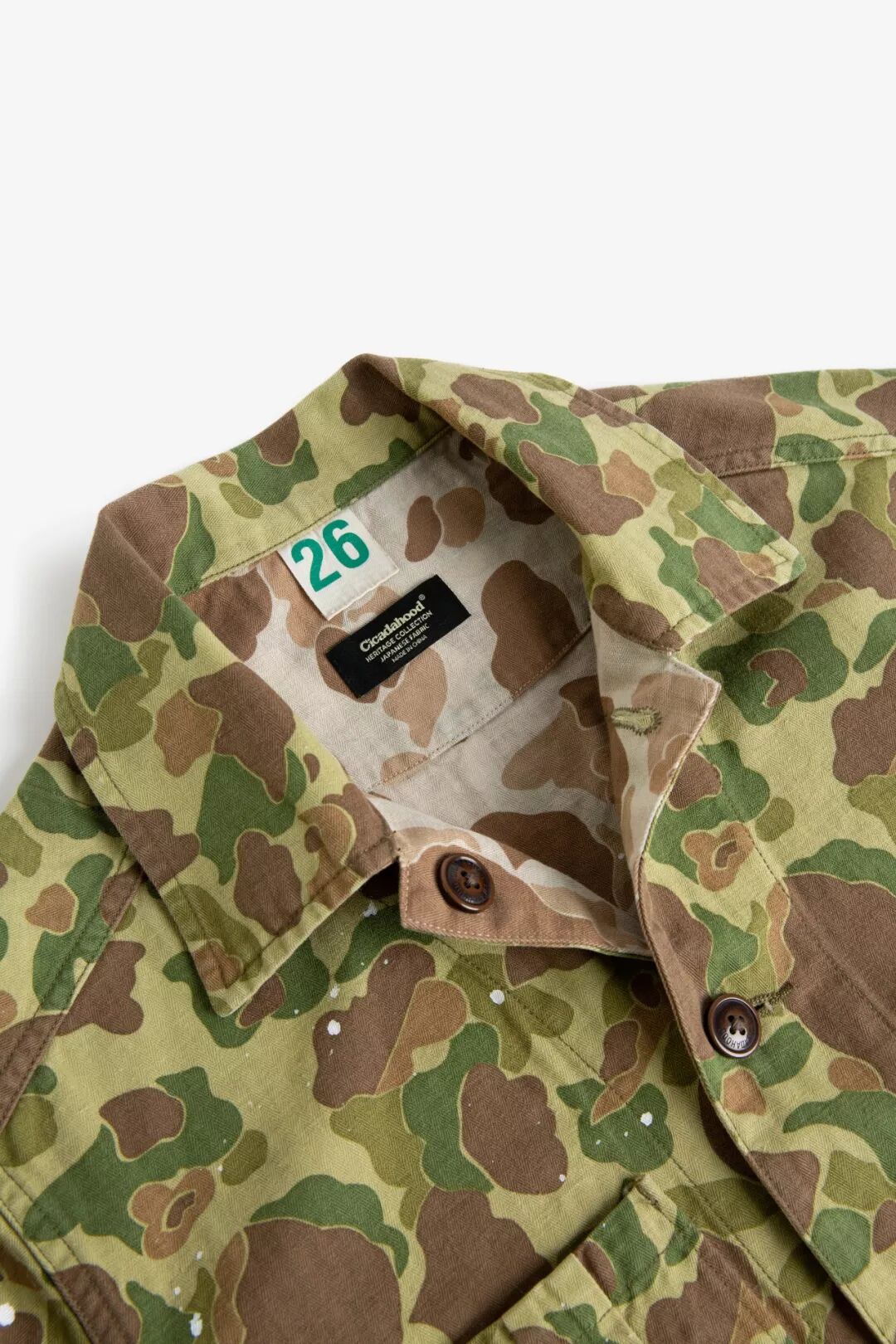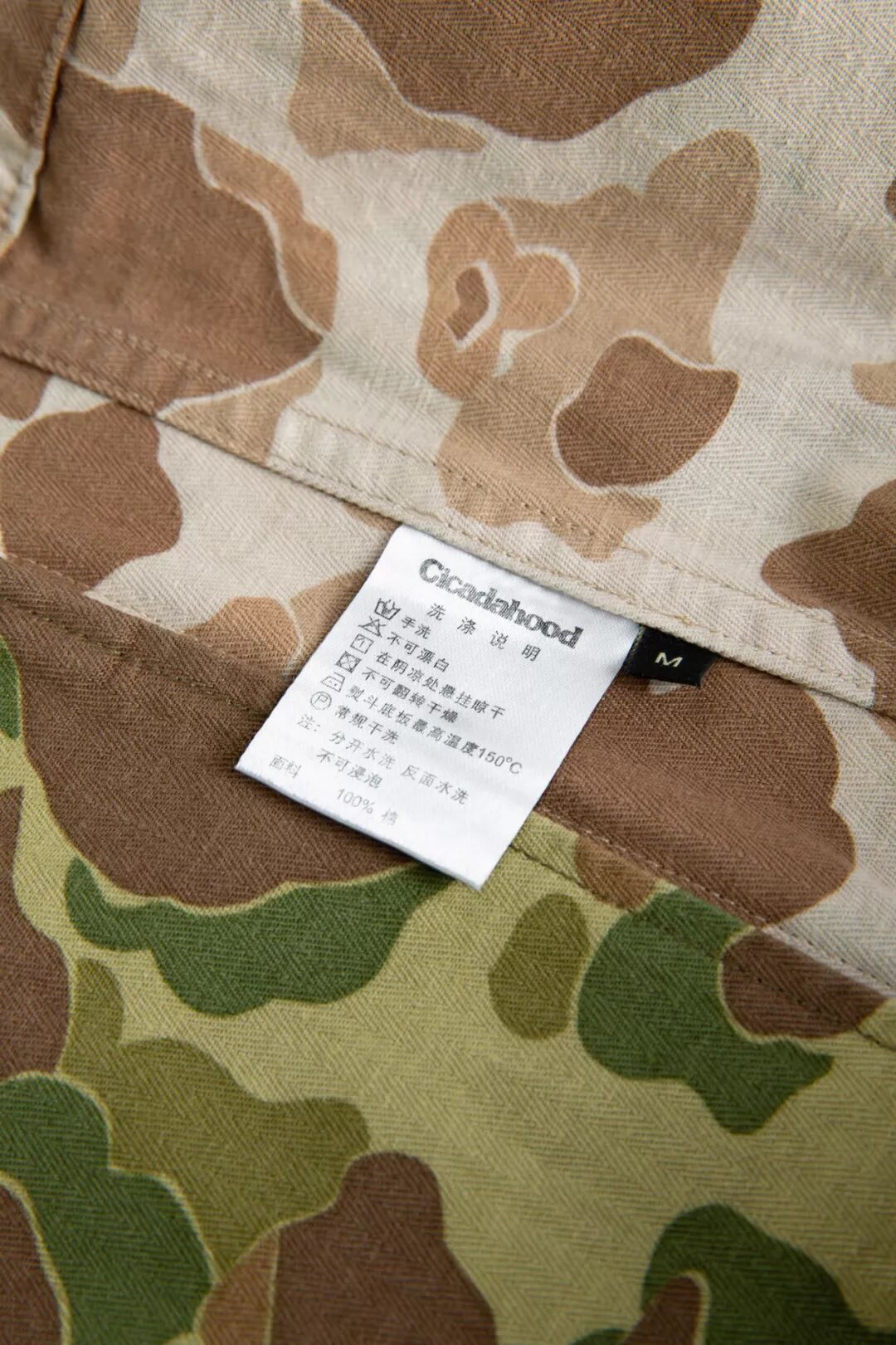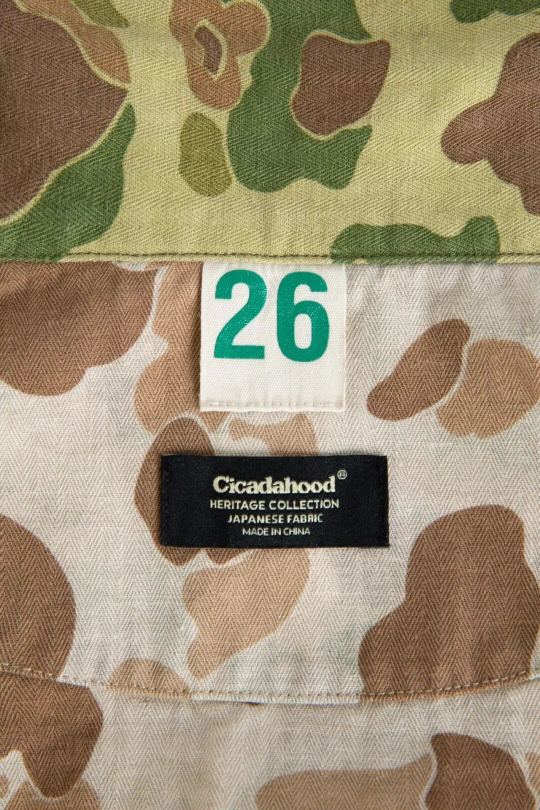 Cicadahood Heritage Collection复刻太平洋战争时期USMC深秋猎鸭迷彩图案面料,并在日本冈山进行纯棉HBT面料的纺织和和双面印刷工艺,保留USMC P42迷彩夹克的弧形门襟和可调节袖口,以功能性五袋设计、双面穿着的方式,与更好的工艺和细节,重塑经典的USMC P42夹克。Cicadahood Heritage Collection USMC 日本造HBT猎鸭迷彩双面夹克使用的迷彩布料织造于日本冈山。使用纤维长、杂质少、韧性强的手工采摘津巴布韦棉纺出的纱线,经冈山县老式窄织机纺织而成的纯棉面料质地细密、柔软舒适、透气性好,后期图案印刷色牢性更强。(津巴布韦长绒棉,图源 allafrica.com)HBT(herringbone twill),也称人字(herringbone,以「V」字两个对称方向织成)斜纹(twill,呈「/」单一方向织成)面料。人字形排列最早用于古罗马地砖的铺陈、古埃及珠宝设计,彼此锁住的排列方式,具有很强的承压能力,后多用于意大利男士粗花呢服装面料的纺织,现在也主要用于高定服装面料的纺织。美国海军陆战队在20世纪30年代末开始将其运用于军事作战服。人字斜纹面料除了具有支撑性好、结实耐磨的特性,还不易产生褶皱、垂坠性好,方便护理,在视觉上也更显纹理和层次感。经冈山县工厂双面印刷,面料正面为偏黄色调深秋猎鸭迷彩,反面为浅咖色猎鸭迷彩,图案色彩附着力强,看起来更加自然、有质感,结合人字斜纹面料的特点,不易褪色。印刷之后,纯棉纺织保留的部分棉籽结头脱落,会使面料表面出现隐约可见的白色斑点,这是纯棉纺织导致的结果,而非印刷瑕疵。经整件酵磨洗水、和做旧泼漆处理,面料更具复古质感和独特的视觉效果,更加耐洗耐穿。Cicadahood Heritage Collection沿用P-42 Camouflage coat的宽松版型与弧线形的门襟,经典的翻领搭配Cicadahood定制纽扣,刻字清晰,精致耐看。袖口可调节松紧,防风御寒,亦可搭配高领毛衣等营造层次感。正面使用功能性的五袋设计,前面两个翻盖口袋带有纽扣,确保物品不会掉落,胸前的pleated打褶口袋里设计有眼镜袢,用于固定眼镜。为保证反面穿着的视觉效果, 反面也增加了口袋的设计,并在胸前车缝有Cicadahood Heritage Collection定制唛标,领扣尺码采用20世纪50年代的军事数字计码方式,复古耐看,增加细节趣味。缝纫细节上,整件夹克由日本进口老式缝纫机与PP线缝纫,走线工整,没有线头,更不会散线起毛。面料连接处采用了内贴边工艺与双针链式结构缝线,反面没有缝头。简约明朗的线条与厚薄适中的面料没有太大的季节与性别限制,适合多季节穿着,男女均可,舒适且具有独特的美式军事风格。Cicadahood Heritage Collection流传下来的十几种迷彩图案,除了被部分潮流品牌用滥的丛林迷彩、虎纹迷彩,还有几种特殊的迷彩图案,有着好看的图案和色彩几乎被大众遗忘,包括猎鸭迷彩、雨滴迷彩、几何迷彩等。深秋猎鸭迷彩偏黄的色调更显复古,在众多迷彩图案中独树一帜,适合军事风格的打造。Cicadahood Heritage Collection