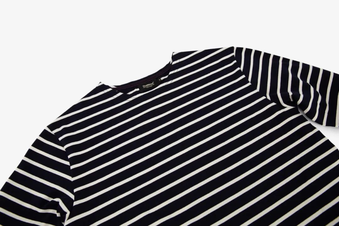 条纹T恤的设计最早源自1858年推出的Breton条纹衫,是法国北部所有海军水手的制服,鲜明的条纹设计使不小心落水的水手很容易被发现。最初的设计有21条条纹,代表拿破仑打下的21场胜仗。Coco Chanel在1917年将条纹衫加入航海系列服装的设计中,对于当时的女性摆脱紧身服饰时尚,改变休闲女装的面貌具有重要意义,也促使水手条纹衫走入日常。