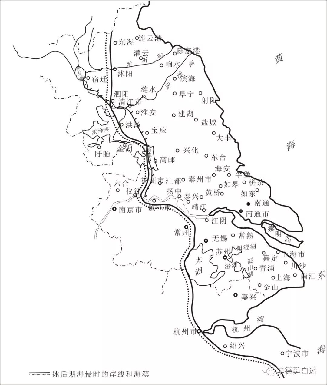 事实上,阻滞苏北海岸地带开发的地理环境因素,还不止于此。在晚更新世前期里斯(庐山)-武木(玉木、大理)间冰期第四纪最大一次海侵到来的时候,今苏北东海、沭阳、泗阳、洪泽、仪征一线以东地区,全部淹入海中(参见“冰后期苏北平原海侵示意图”)。武木冰期以后,进入全新世,海陆交替,回旋振荡,往复不下三番[5],今白马湖、宝应湖、高邮湖、邵伯湖、洪泽湖等一系列湖泊,当时都是海水所浸灌的区域;此外,在范公堤一线以内,也沿海岸留下了一组数目繁多的潟湖群。大约在距今6,000年前后,始在今范公堤一线,形成比较稳定的海岸线[6]。