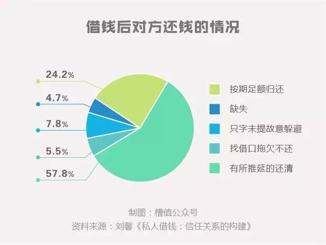 学者刘馨曾做过一个样本调查,结果显示,“借钱后对方还钱情况”中按期足额归还的,只占到24.2%,不到四分之一。
