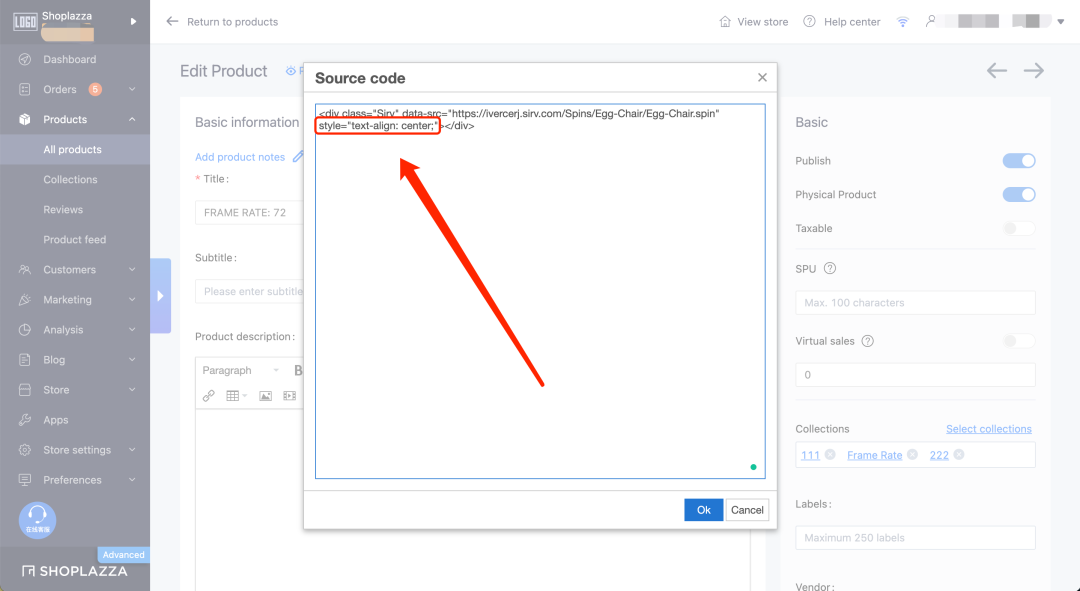 依次找到“商品-商品管理”,找到对应商品的描述部分,点击编辑框右上角“源代码(Source code)”将在 Sirv 中拿到的第一行代码复制粘贴进来。
