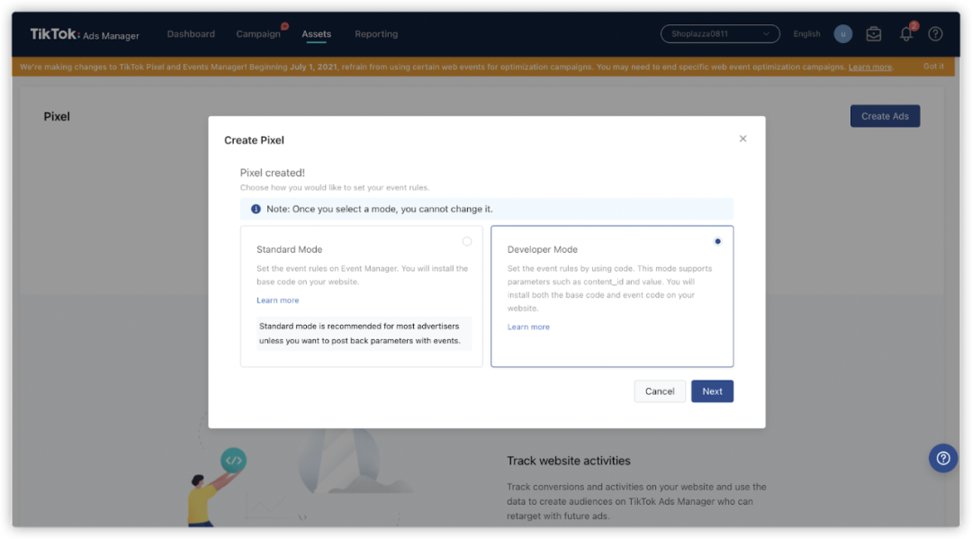 目前,TikTok Pixel 分两种模式,一种是标准模式( Standard Mode ),一种是开发者模式 ( Developer Mode )。
