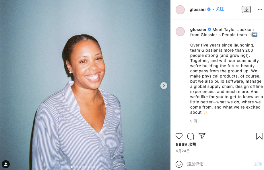 此外,Glossier 还会定期在 IG 展示公司员工,提升员工使命感、幸福度及满意度,这种做法除了使企业的业务人性化之外,还激发了对企业家精神感兴趣的消费者的关注。