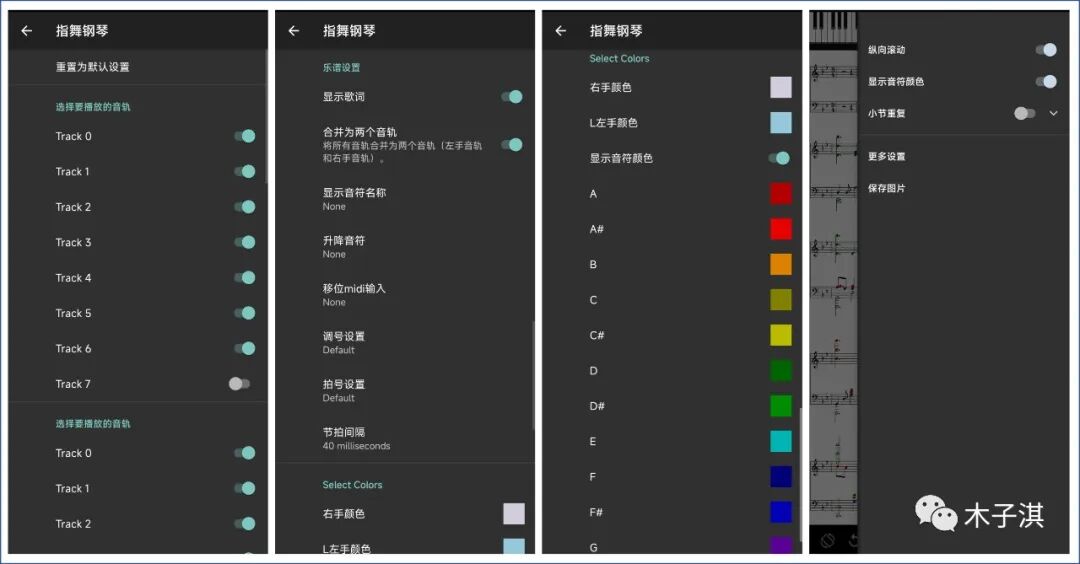 它还支持选择要播放的音轨,为音轨设置乐器、丰富的乐谱设置,其中乐谱设置包括:节拍间隔、调号设置、升降音符、显示音符名称、合并为两个音轨。
