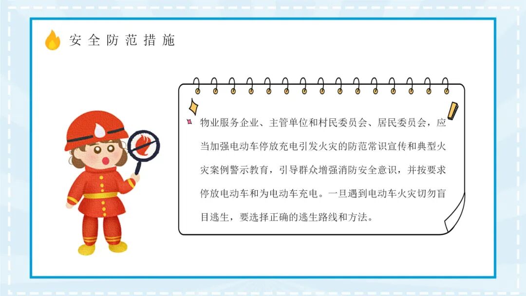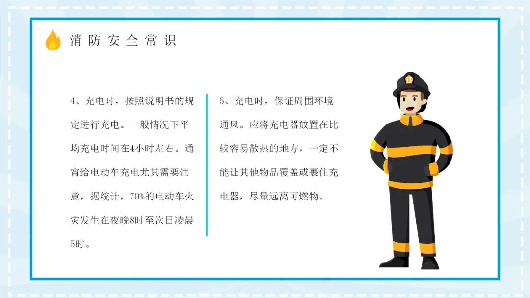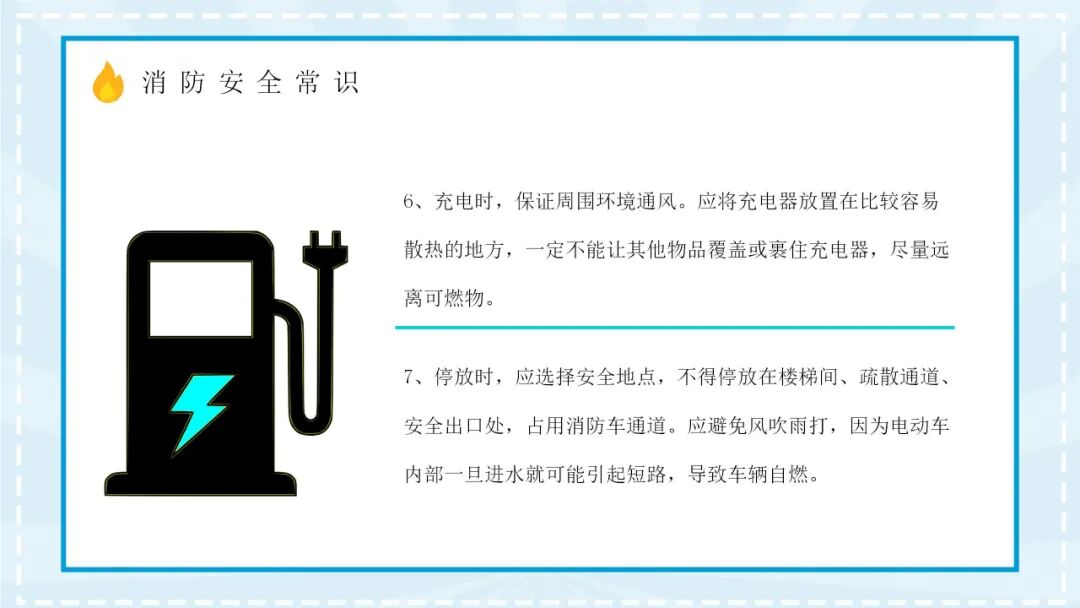 电动车在充电时,不在客厅或楼梯间、走道内充电,在其他地方充电时要仔细检查并清理附近堆放的易燃可燃物品,以防电动车在起火时引燃附近的物品,造成更大的火灾。
