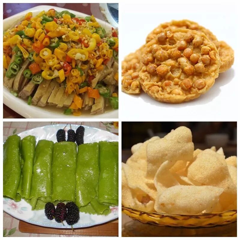 自上而下,从左至右,分别是酸酒鸭、月亮巴、灰水粄、烫皮。