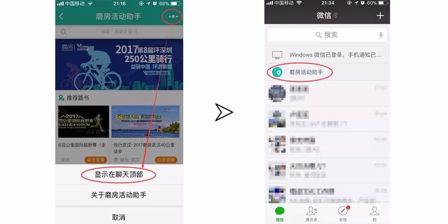 ② 即可方便地将“磨房活动助手”小程序展示在微信聊天列表顶部,迅速切换聊天对话框和查看轨迹两不误。
