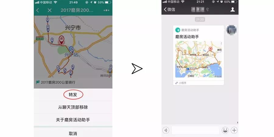 ② 即可将当前活动轨迹路书转发至微信好友或微信群,与队友及家人朋友分享。