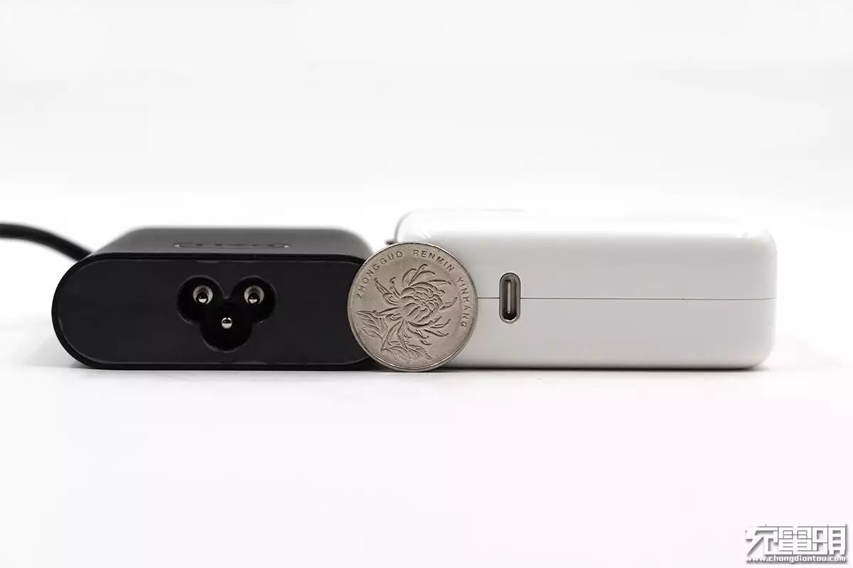 苹果61W USB PD充电器是13寸MacBook Pro的标配,前不久,充电头网的小编已经对其进行过详细的拆解评测。戴尔65W USB PD充电器是戴尔今年新款笔记本的标配。在厚度方面,戴尔65W USB PD充电器的约为23mm,比1元硬币的直径小不少,同时也要比苹果61W充电器更薄。