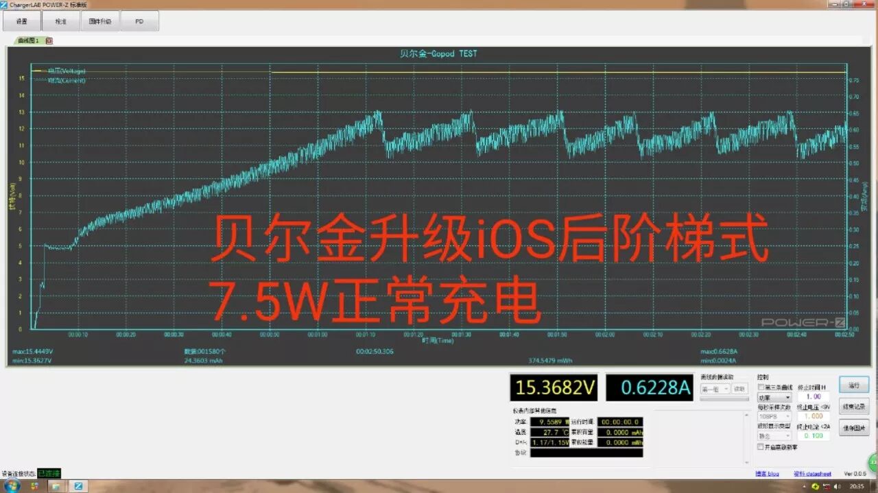 有工程师在更新iOS 11.2正式版之后对Gopod与belkin、mophie进行对比测试,三者都能实现7.5W无线快充,其中belkin和mophie都是阶梯式,而Gopod 7.5W则是稳定充电。