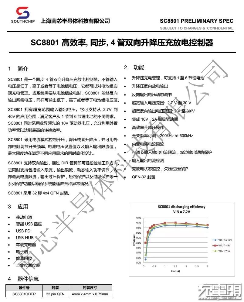 SC8801这款芯片在技术和时间上均处于全球领先的位置,是全球第一款具有快充功能、支持PD升降压的芯片,可以实现双向100W充放电,并且控制精准,性能稳定,显著降低充电所需时间,可以广泛应用于智能手机、PAD、电视、笔记本、汽车等消费电子品和充电外设产品。技术遥遥领先于国内外品牌,具有很强的先发优势和行业口碑,是国产芯片替代趋势中一股势不可挡的技术浪潮。