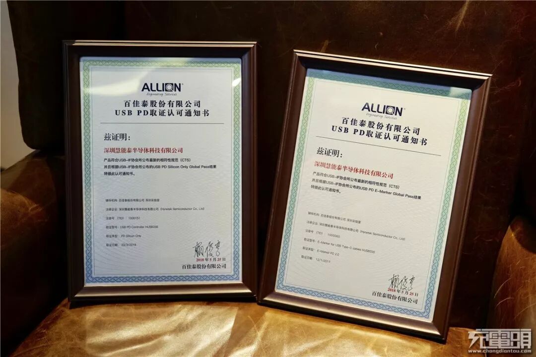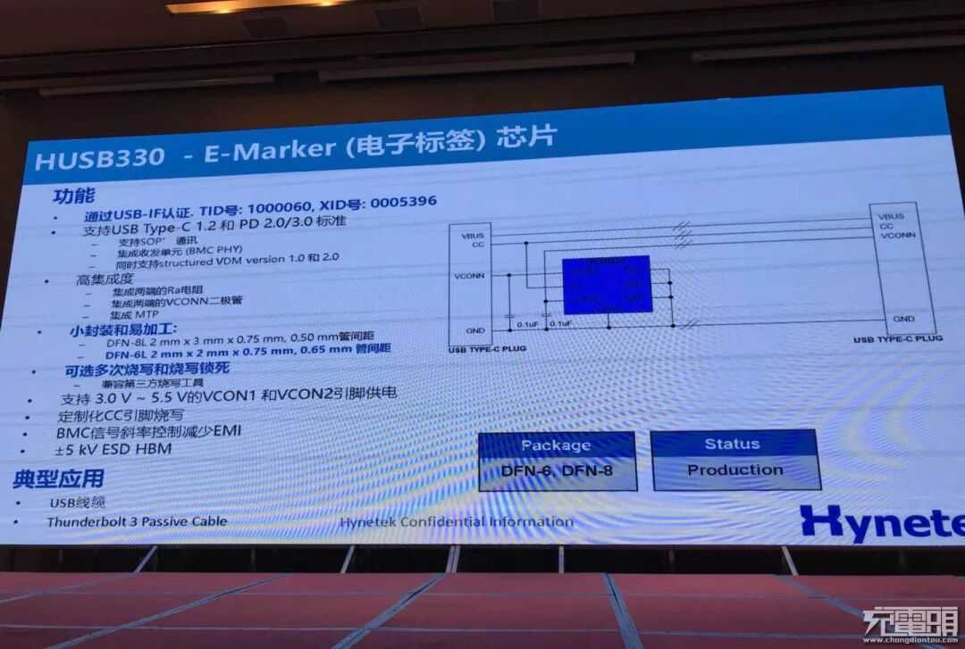 2018年5月25日,深圳慧能泰半导体科技有限公司(Hynetek Semiconductor)在深圳科兴科学园举行新品发布会,重磅推出USB PD芯片HUSB338与E-Marker芯片HUSB330。Hynetek慧能泰HUSB330是中国大陆地区首颗取得USB-IF认证并实现量产的E-Marker芯片。两款芯片同时面世,让Hynetek慧能泰成为了目前国内唯一一家同时获得USB-IF E-Marker认证和USB PD认证的企业。